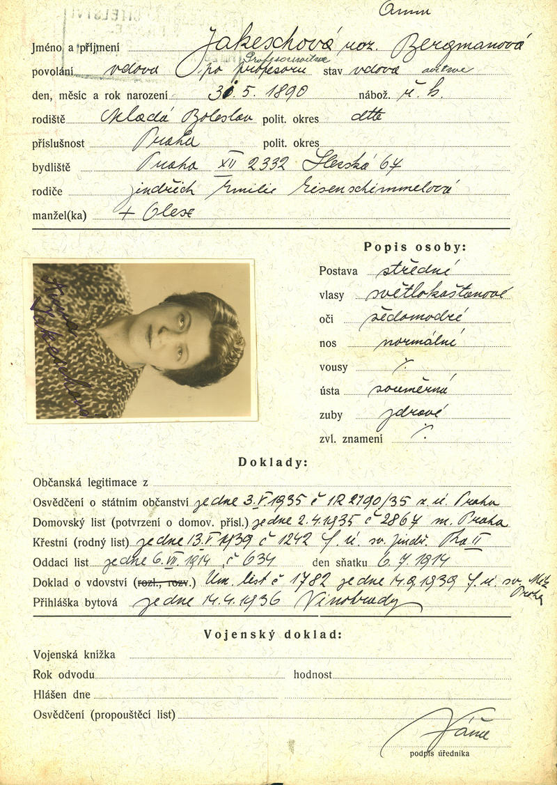 Jakeschová Anna: Žádost o vydání občanské legitimace