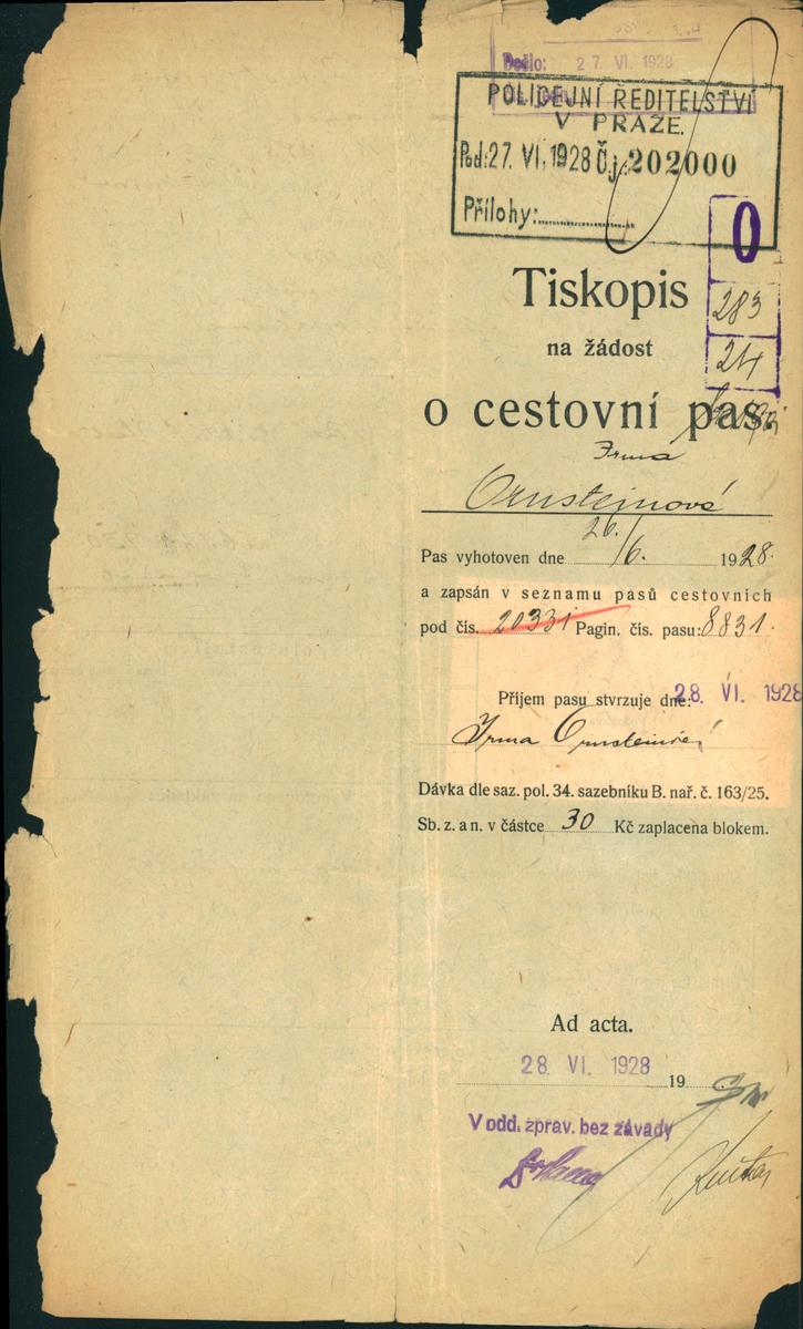 Ornsteinová Irma: Žádost o vydání cestovního pasu