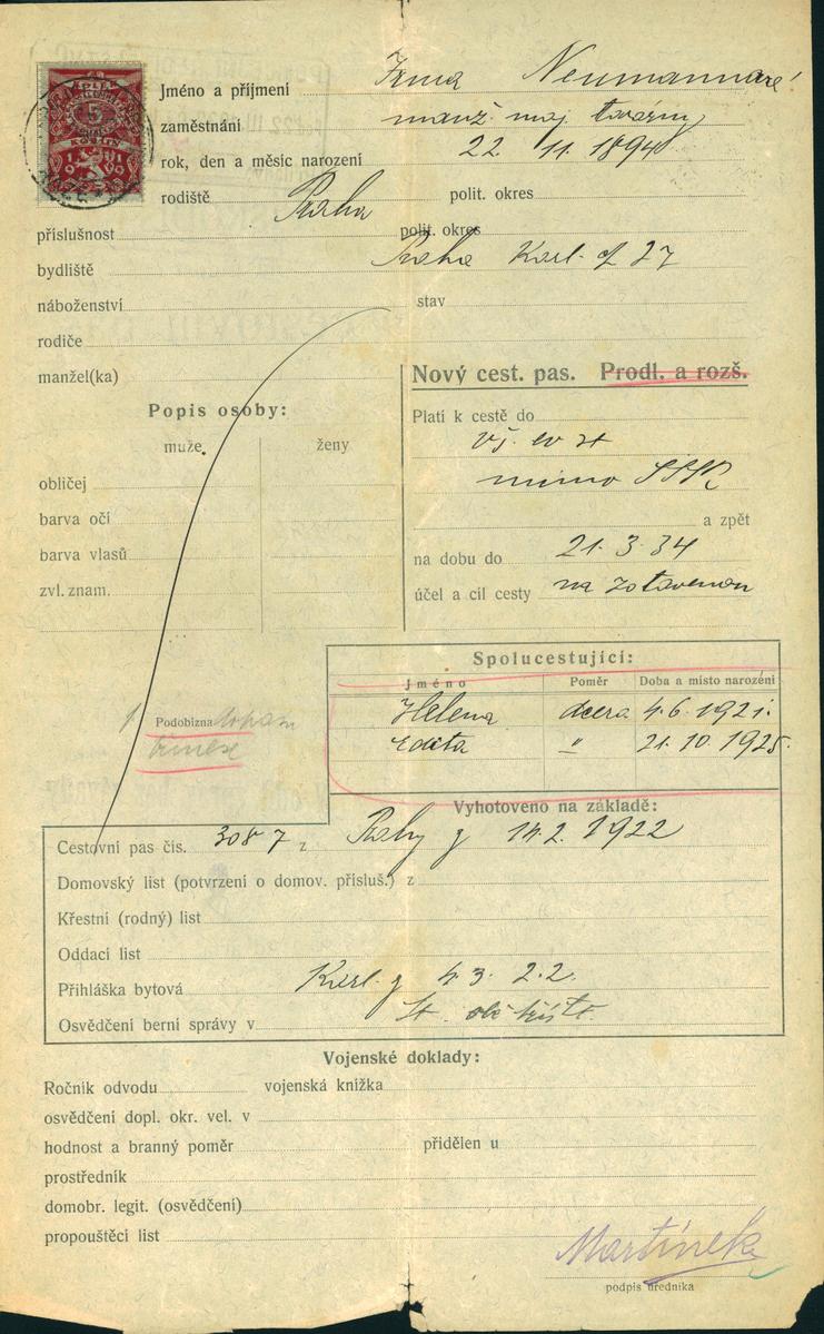 Neumannová Irma: Žádost o vydání cestovního pasu