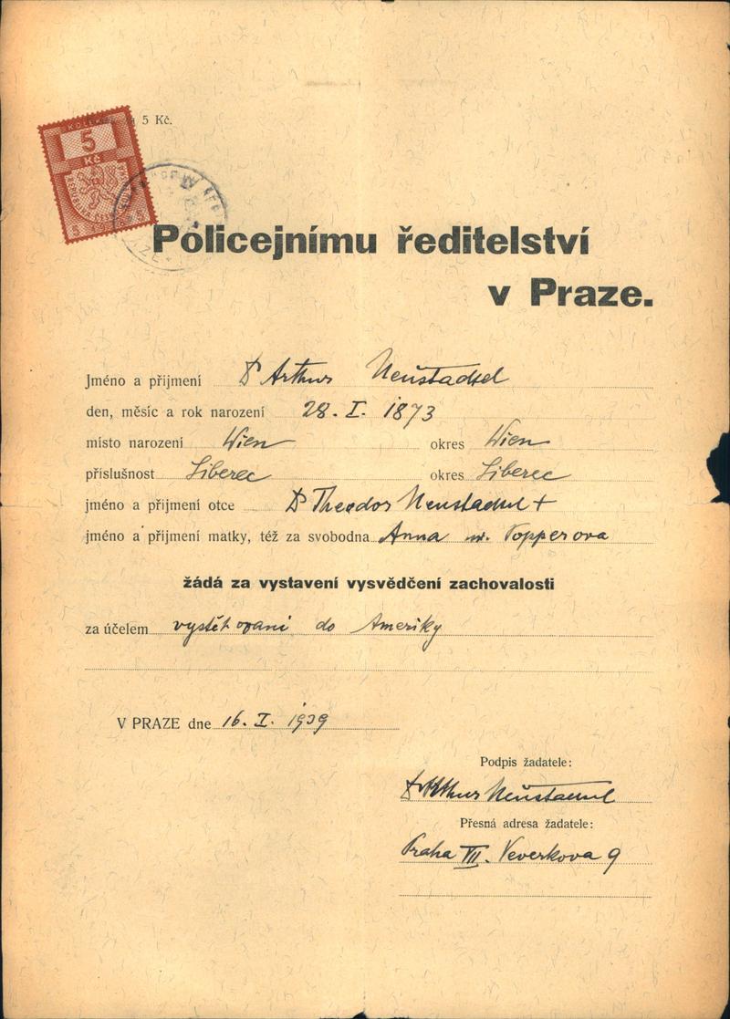 Neustadtel Artur: Žádost o vystavení vysvědčení zachovalosti