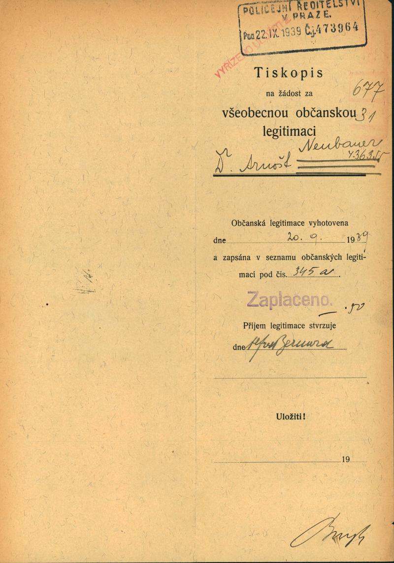 Neubauer Arnošt: Žádost o vydání občanské legitimace