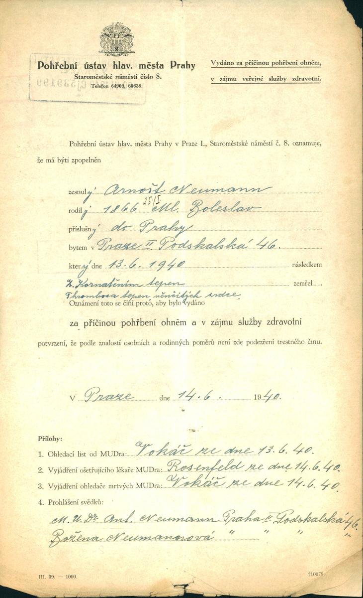 Neumann Arnošt: Žádost o potvrzení k pohřbení ohněm