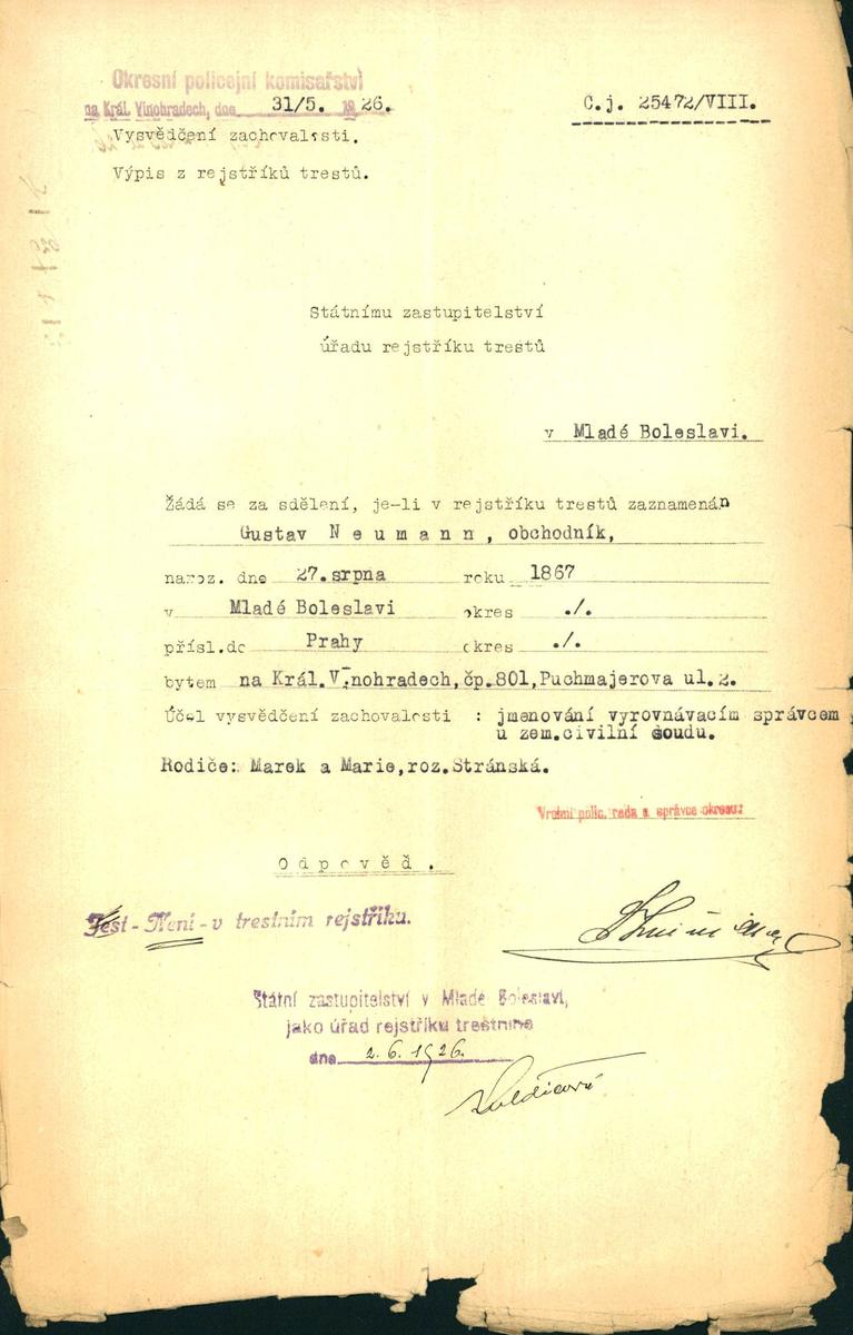 Národní archiv Praha > Policejní ředitelství v Praze > 1941-1950 > N > Neumann Gustav