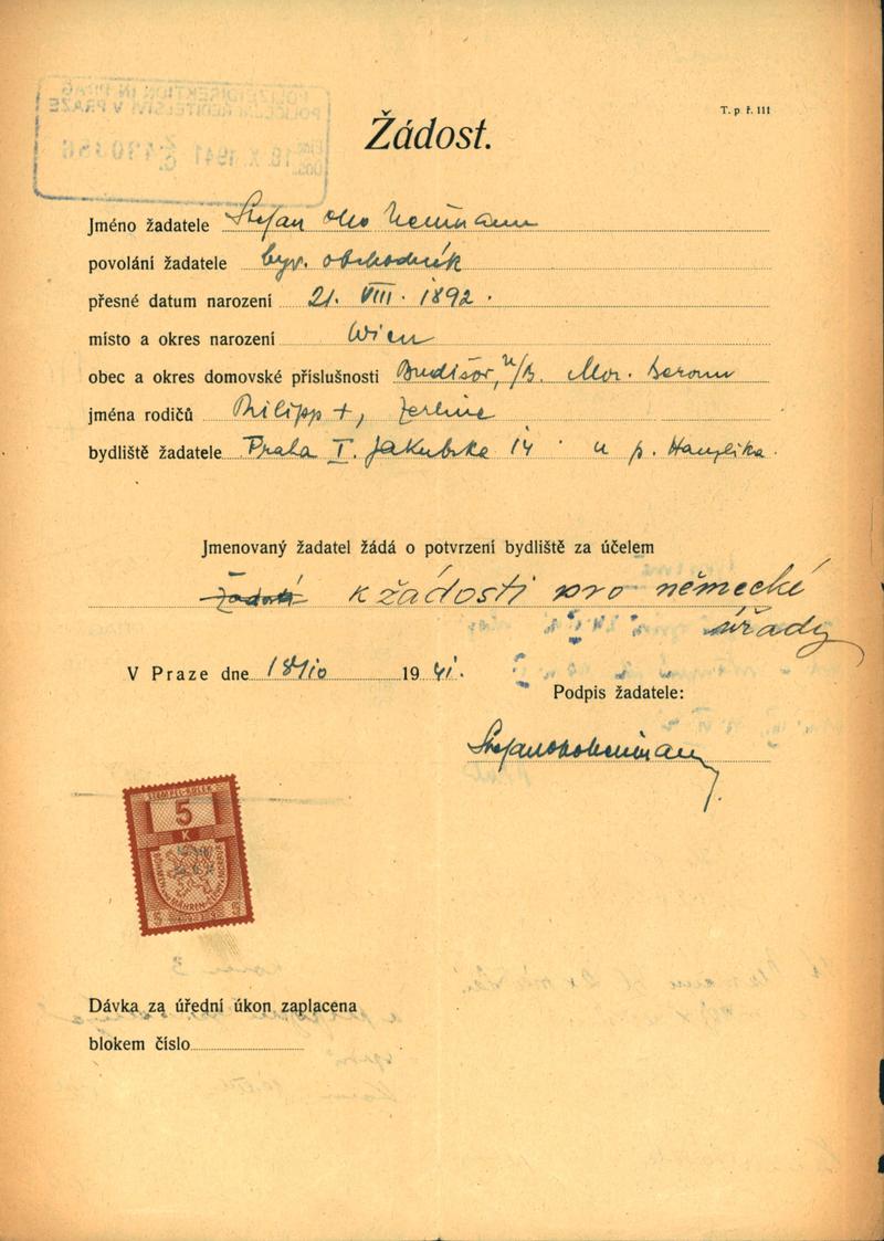 Neumann Otto Stefan: Žádost o potvrzení pobytu