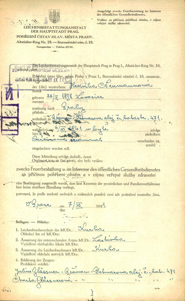 Neumannová Hedwig: Žádost o potvrzení k pohřbení ohněm
