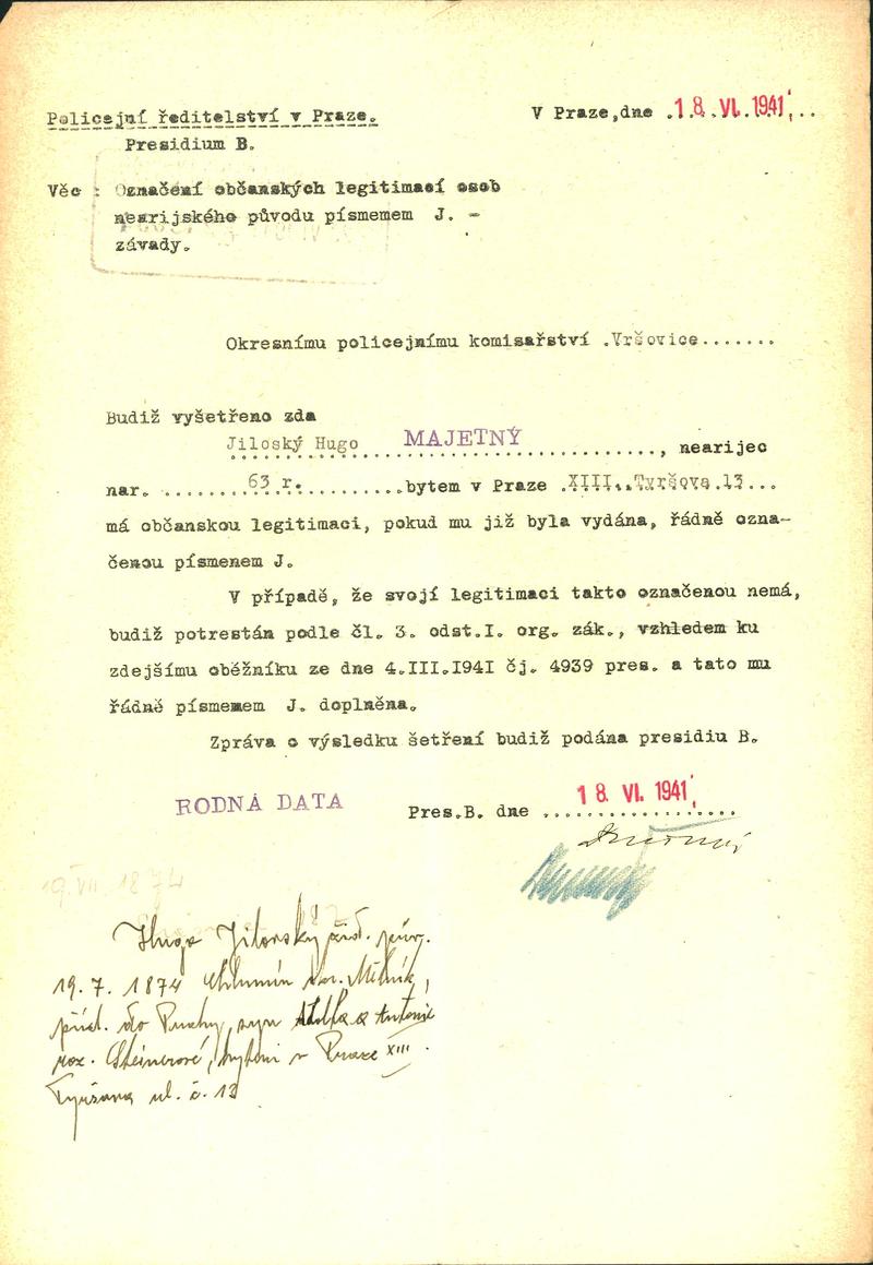 Jílovský Hugo: Označení občanských legitimací písmenem J