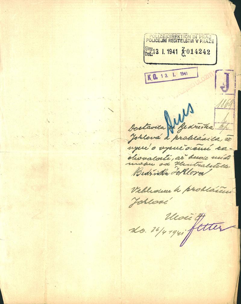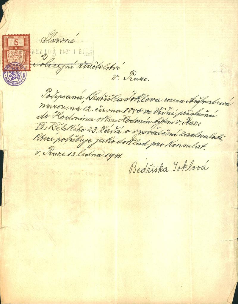 Joklová Bedřiška: Žádost o vystavení vysvědčení zachovalosti