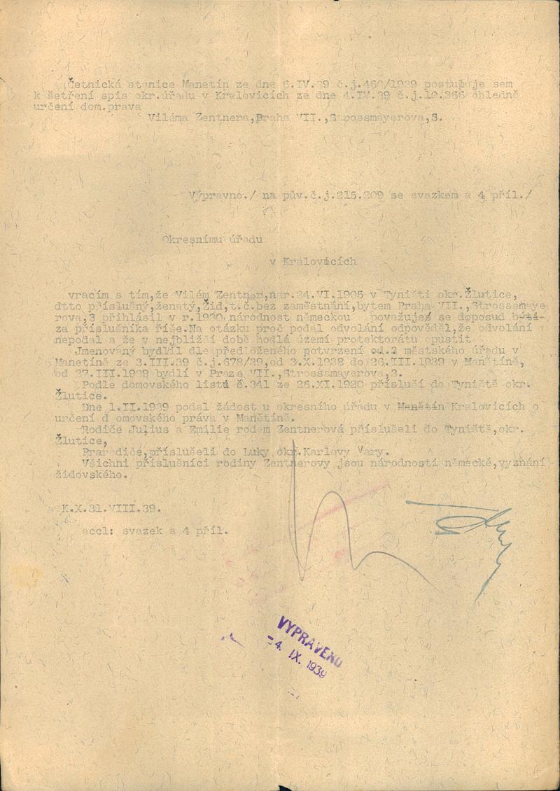 Zentner Vilém: Šetření ve věci určení domovského práva