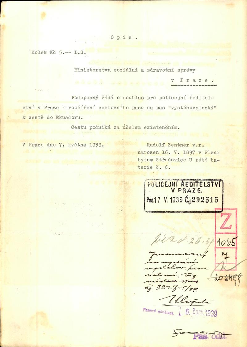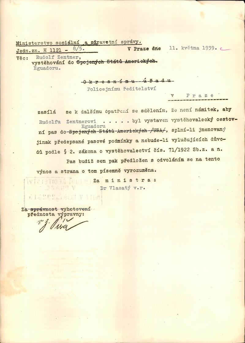 Zentner Rudolf: Souhlas s vydáním vystěhovaleckého cestovního pasu