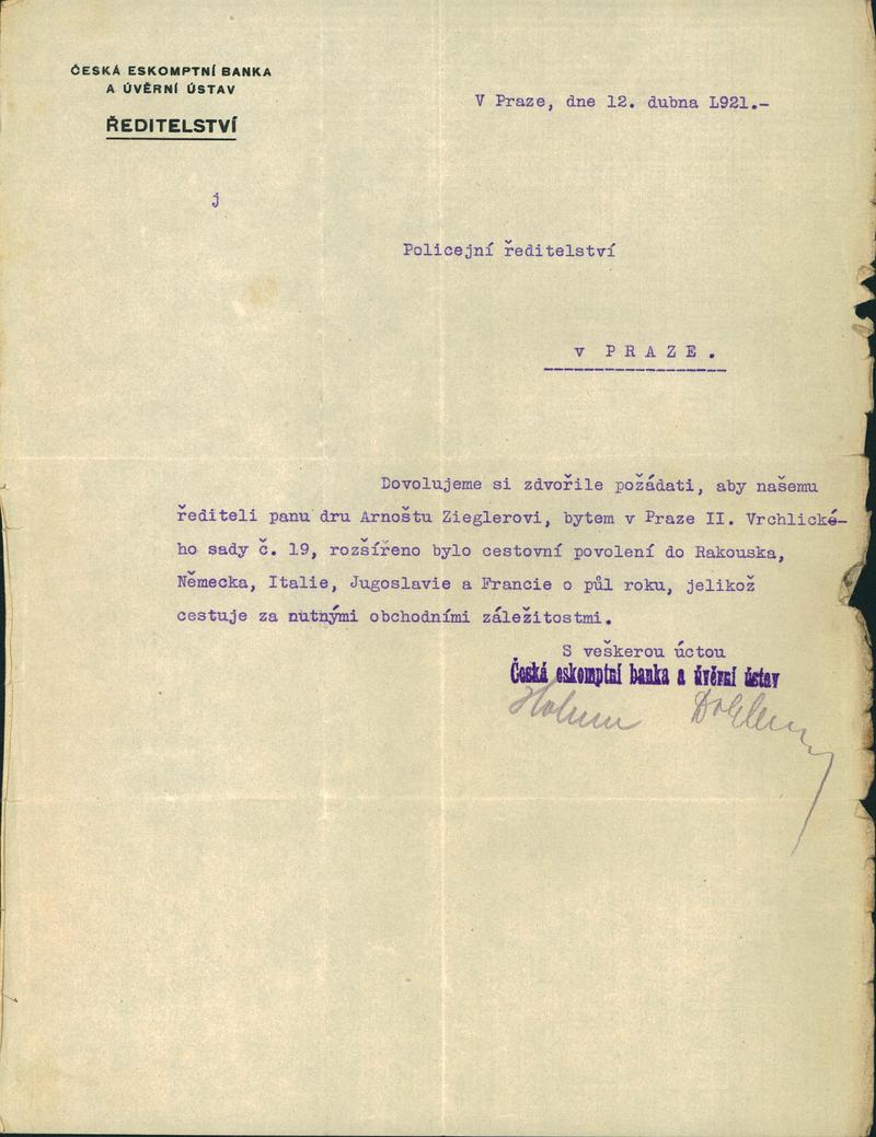 Ziegler Arnošt: Žádost o rozšíření cestovního pasu