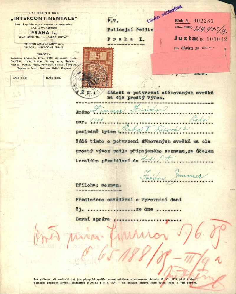 Zimmer Izidor: Žádost o potvrzení seznamu stěhovacích svršků