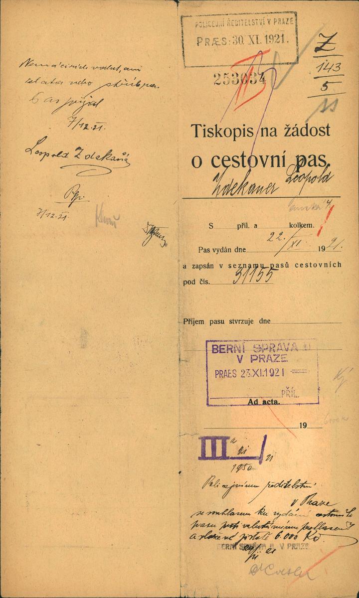 Zdekauer Leopold: Žádost o vydání cestovního pasu