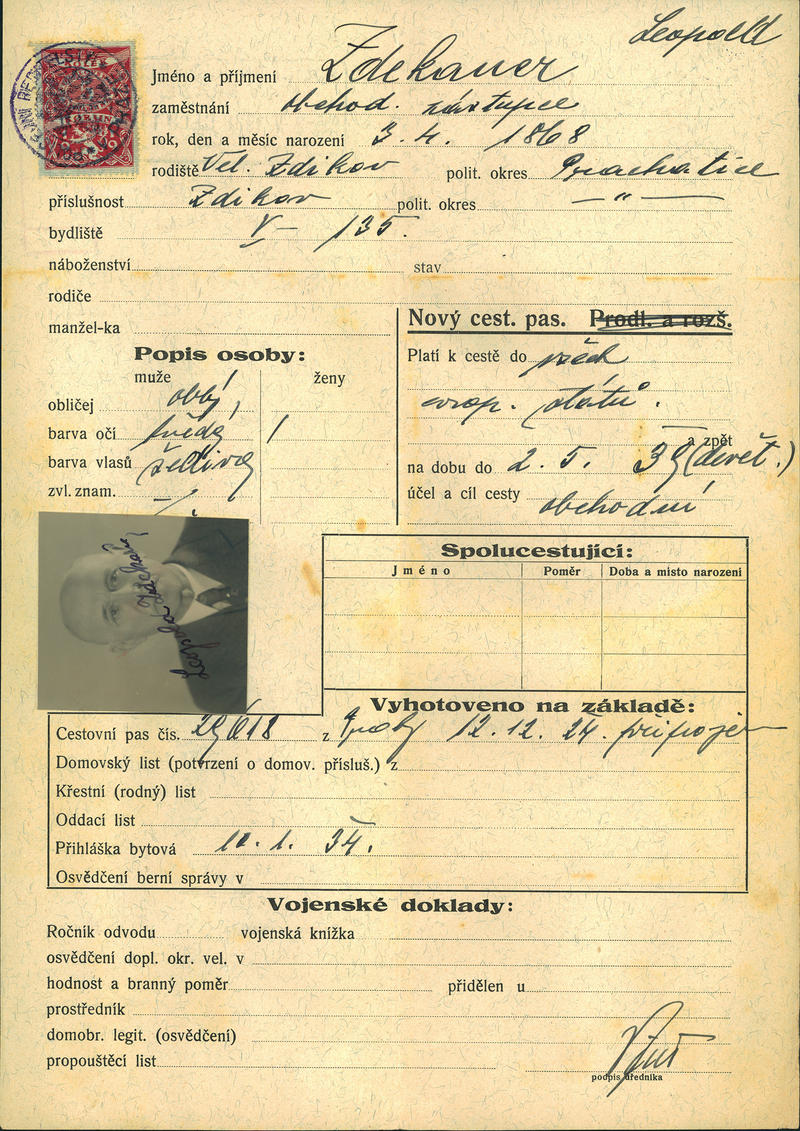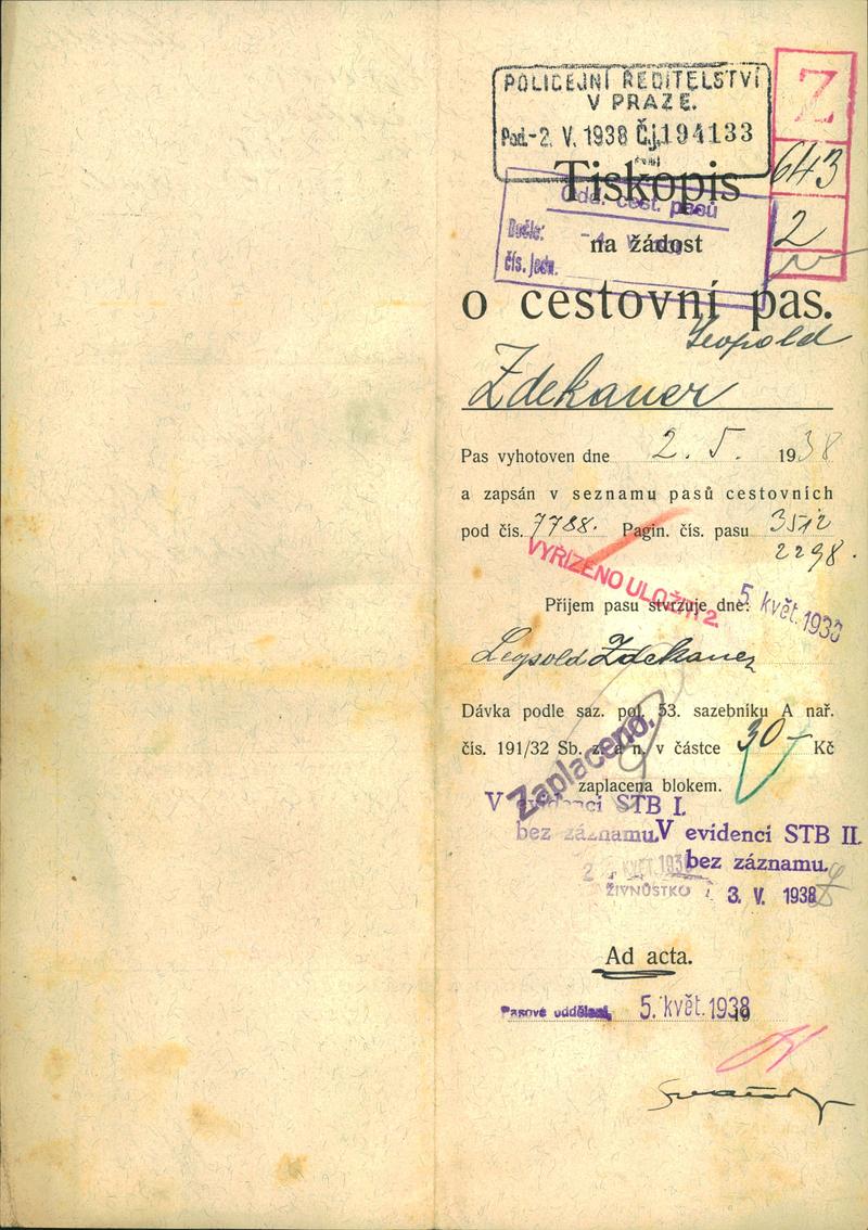 Zdekauer Leopold: Žádost o vydání cestovního pasu