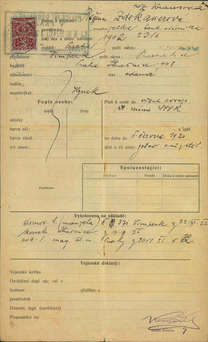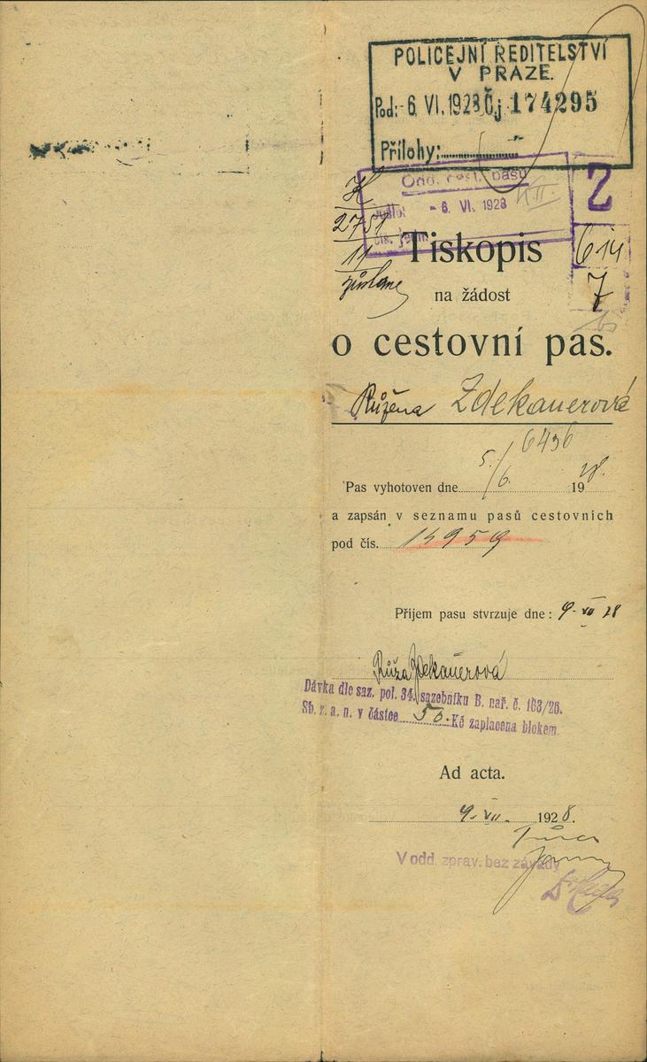 Zdekauerová Růžena: Žádost o vydání cestovního pasu