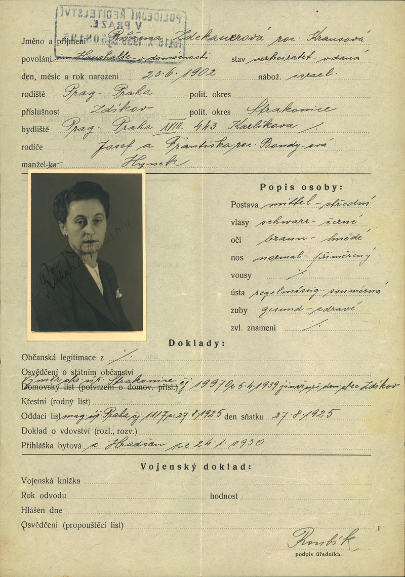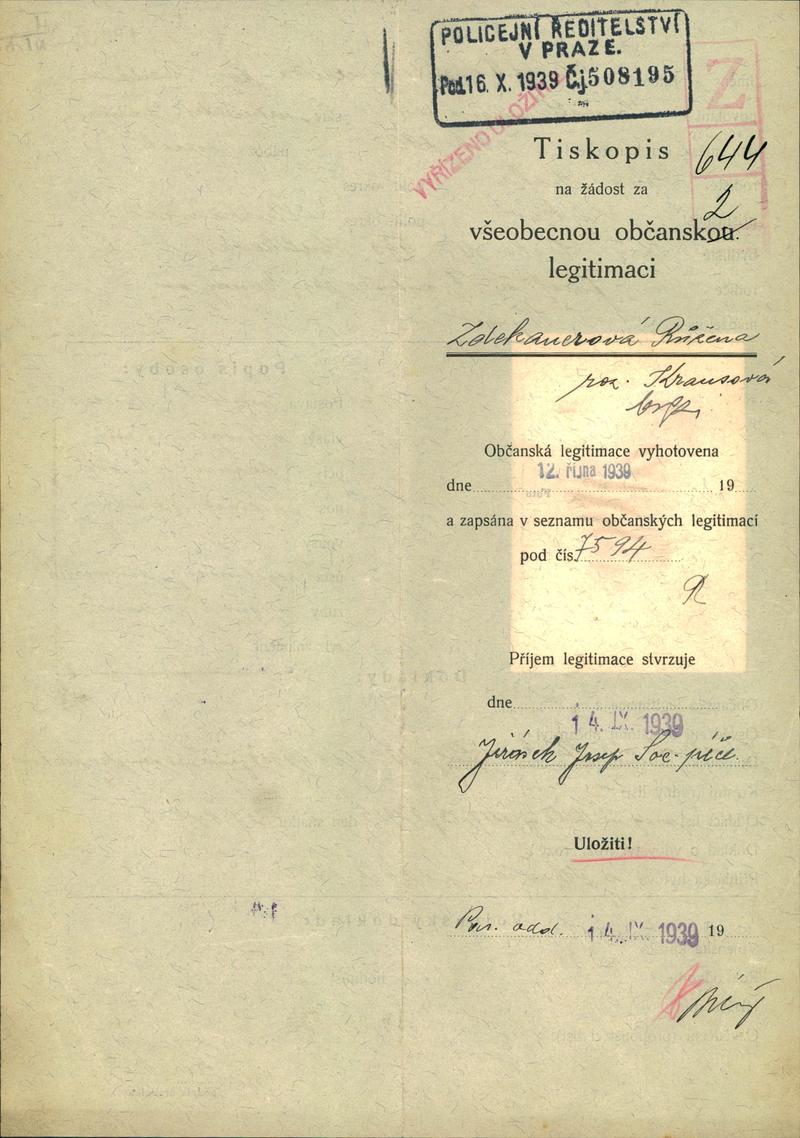 Zdekauerová Růžena: Žádost o vydání občanské legitimace