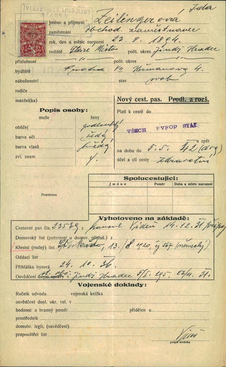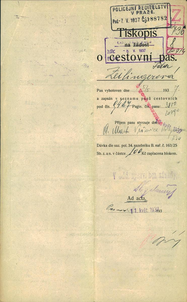 Zeilingerová Ida: Žádost o vydání cestovního pasu