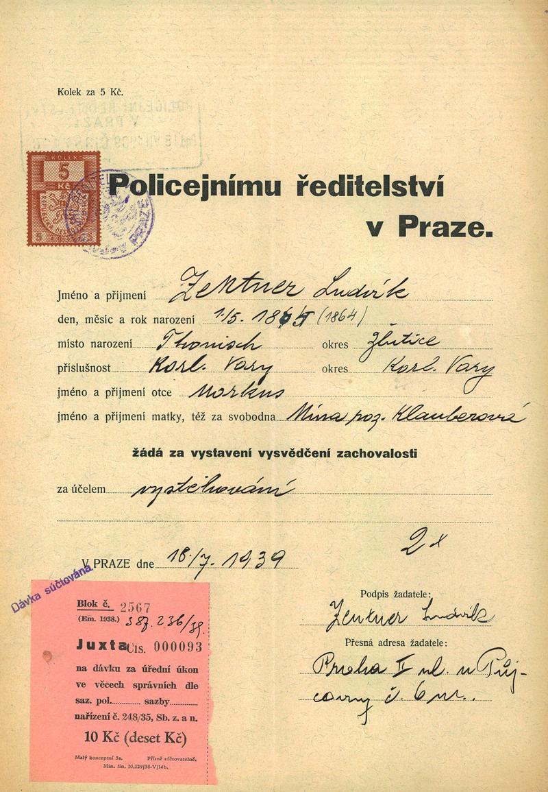 Zentner Ludwig: Žádost o vystavení vysvědčení zachovalosti