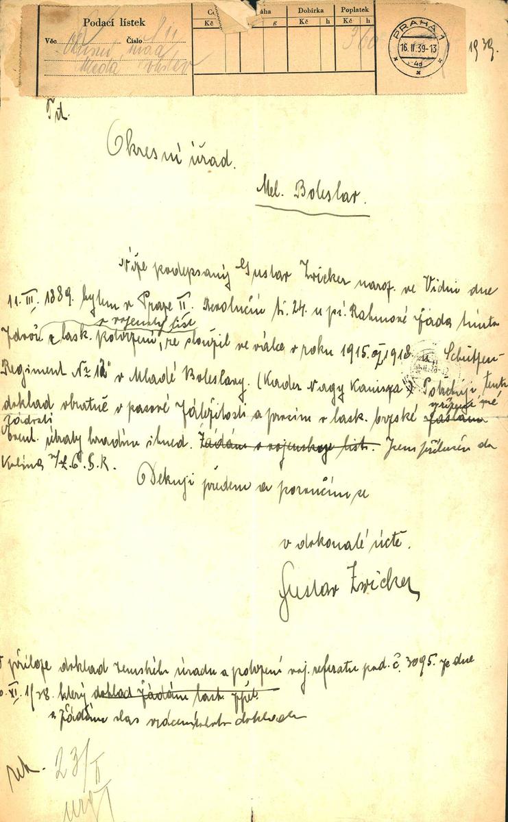 Zwicker Gustav: Žádost o potvrzení vojenské služby