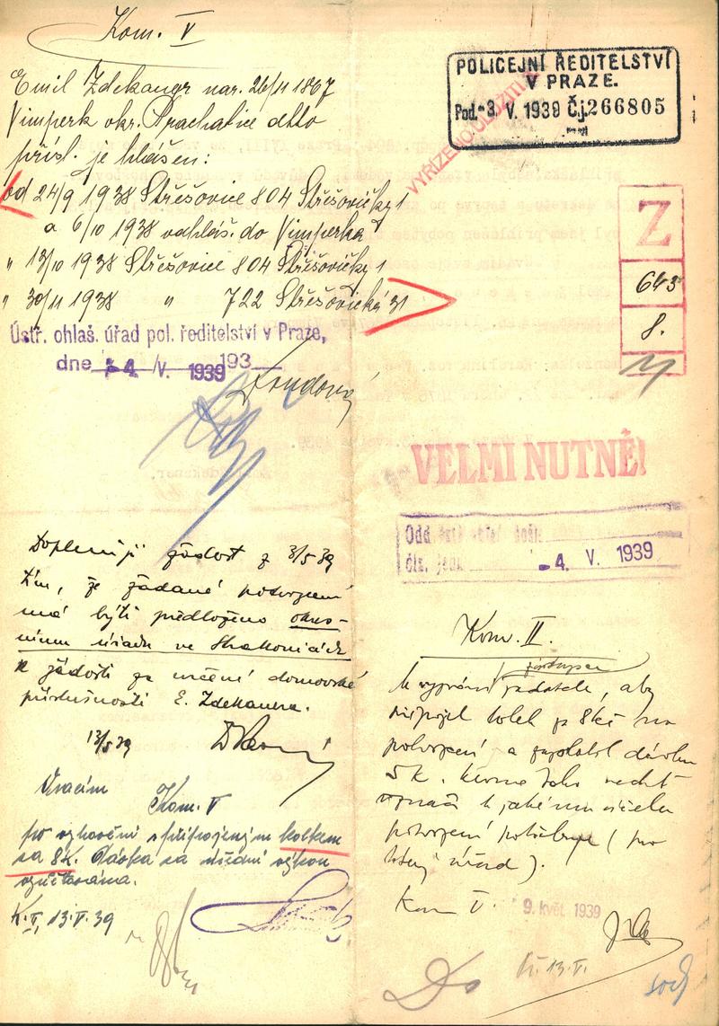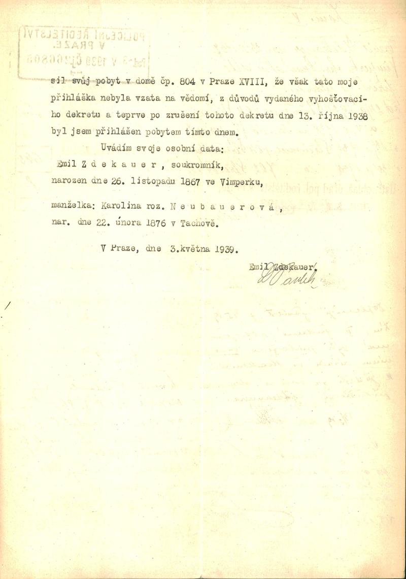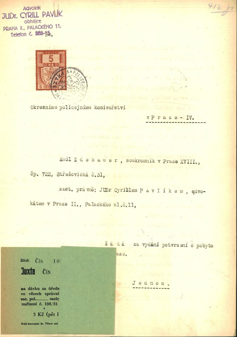 Zdekauer Emil: Žádost o potvrzení pobytu