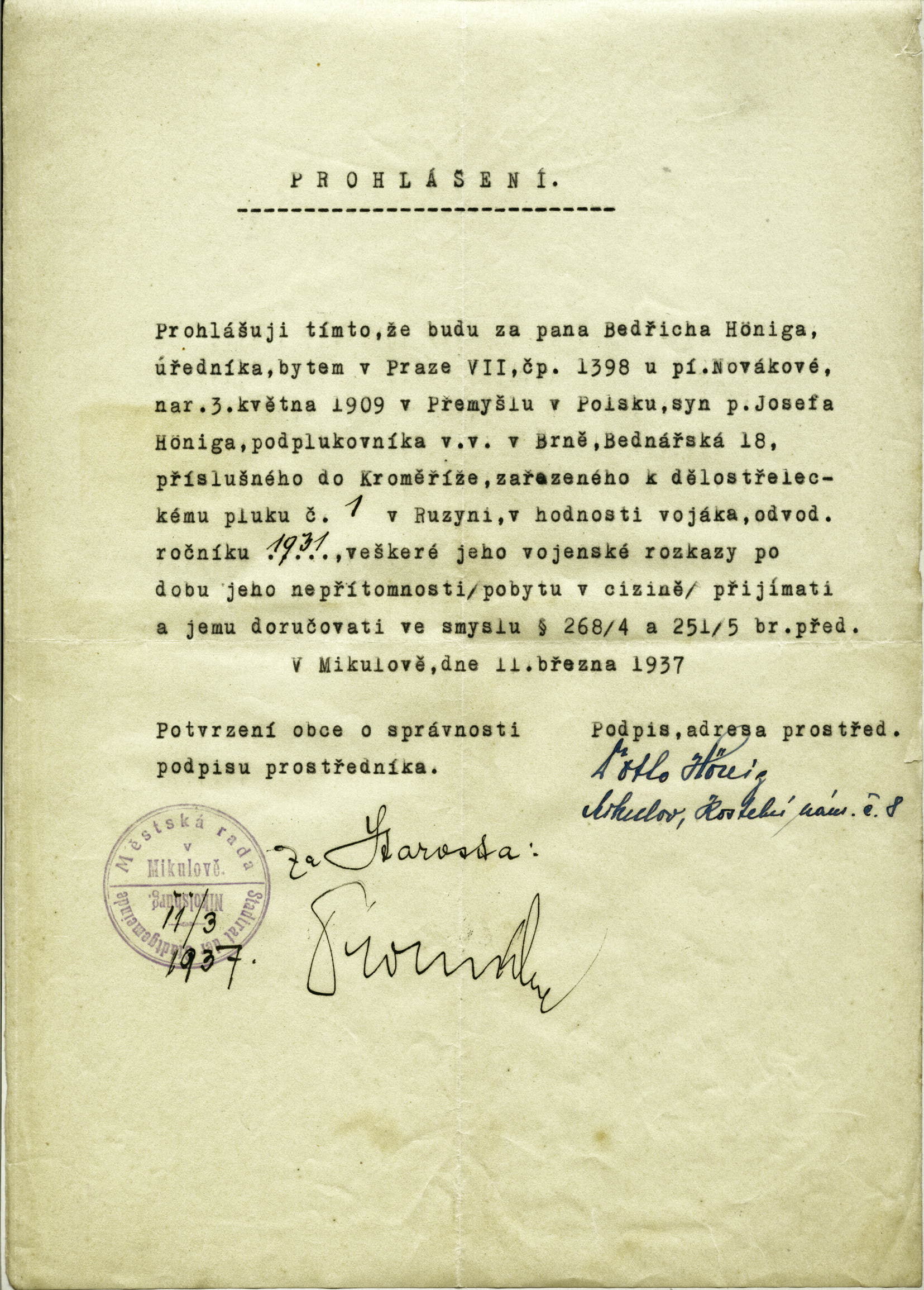 Hönig Bedřich: Prostředník ve věcech vojenských