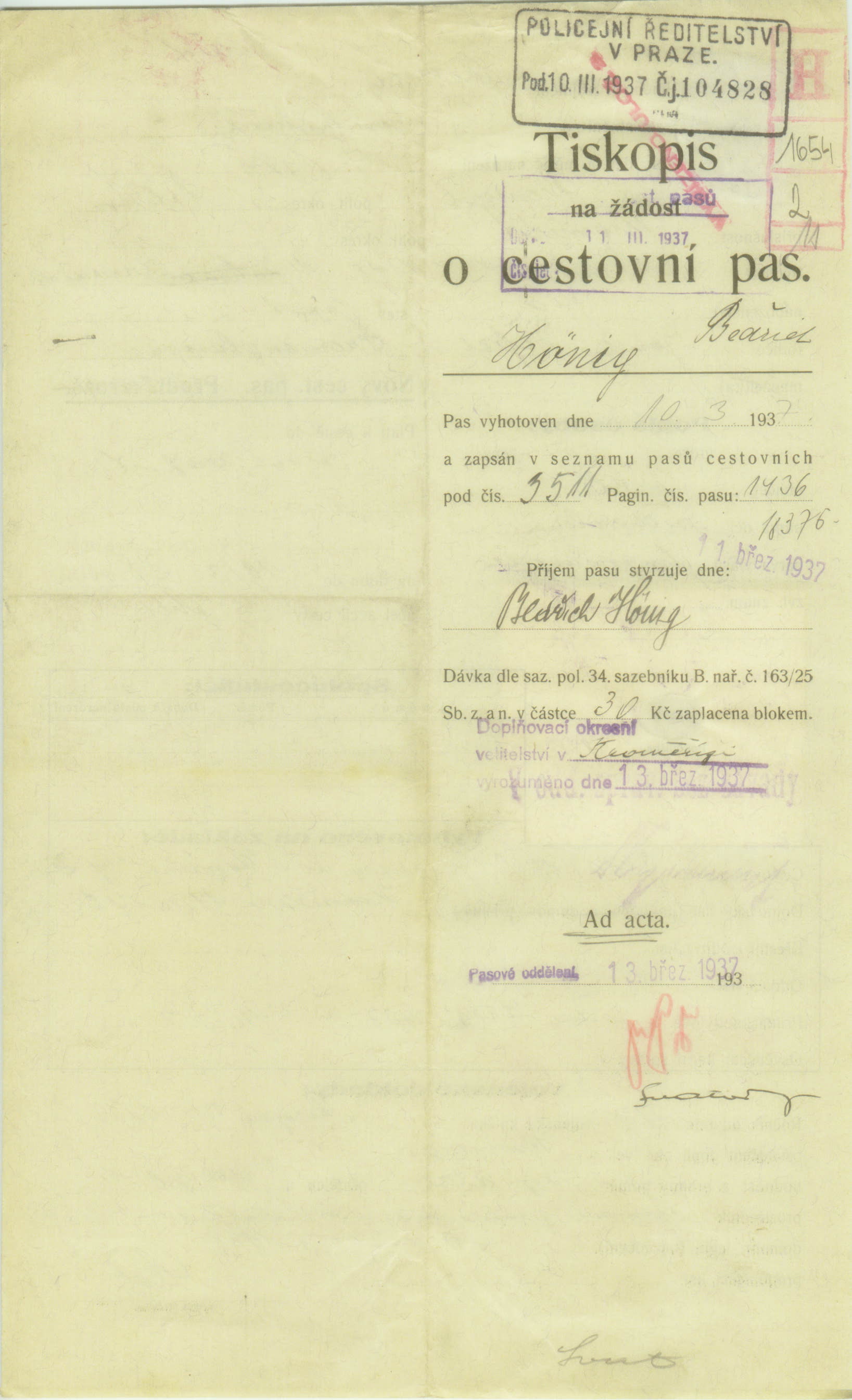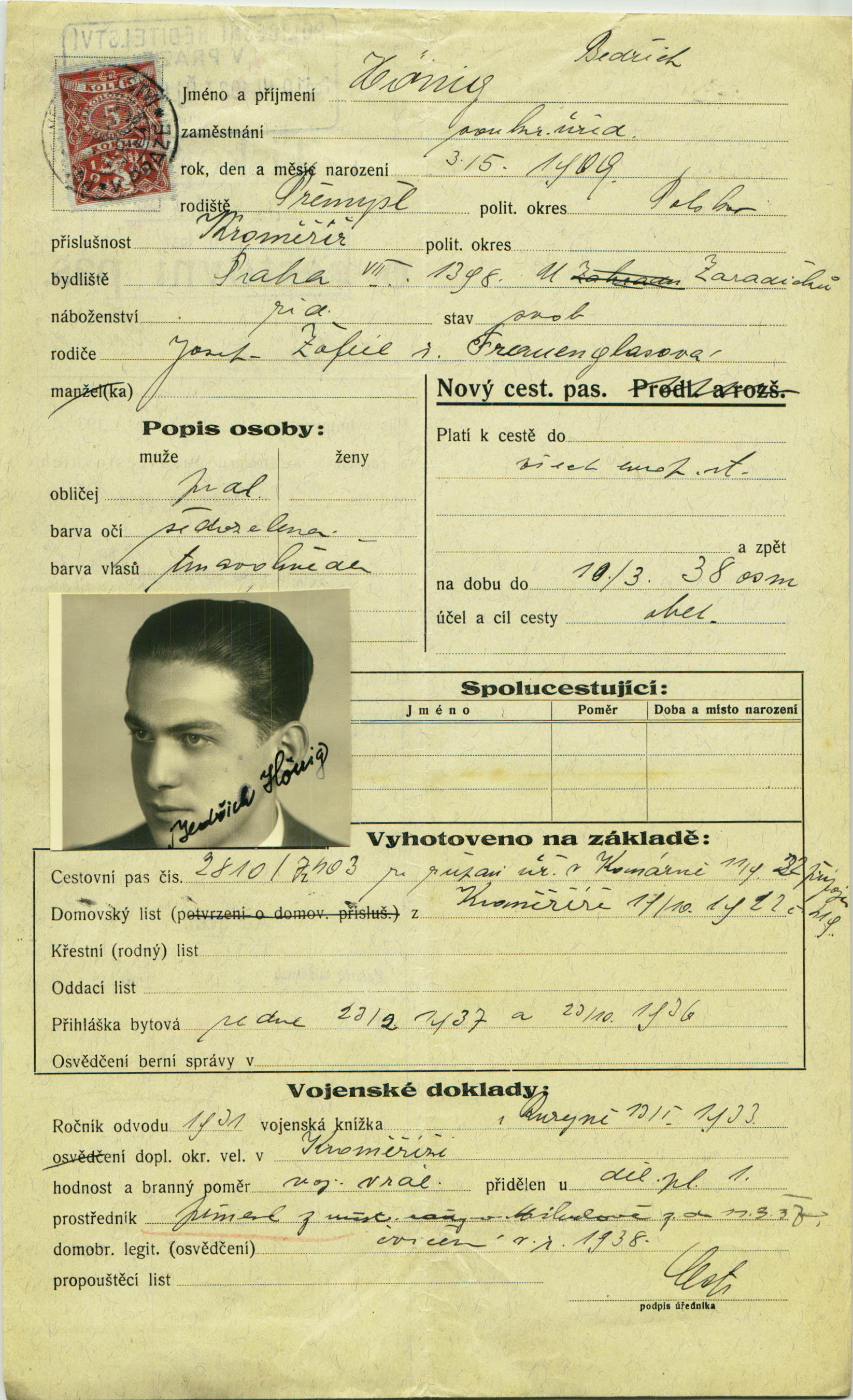 Hönig Bedřich: Žádost o vydání cestovního pasu
