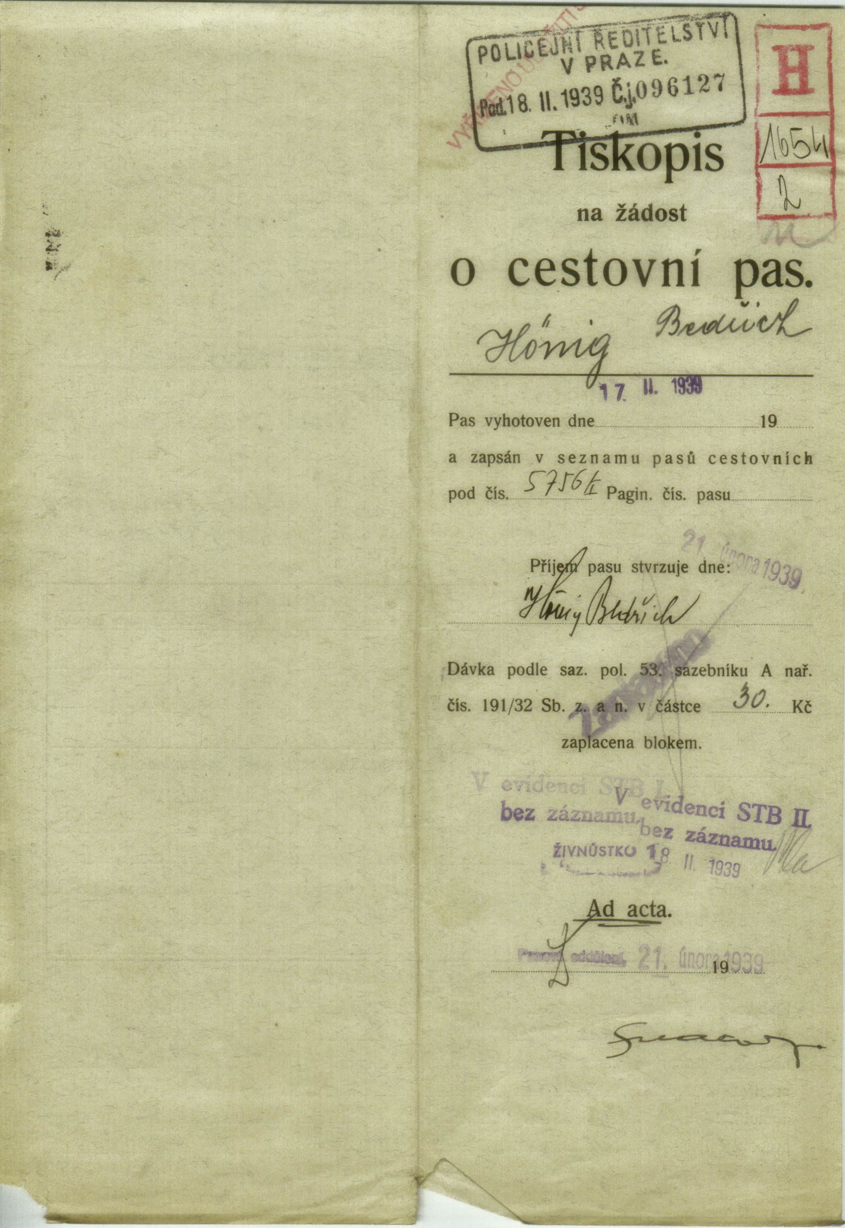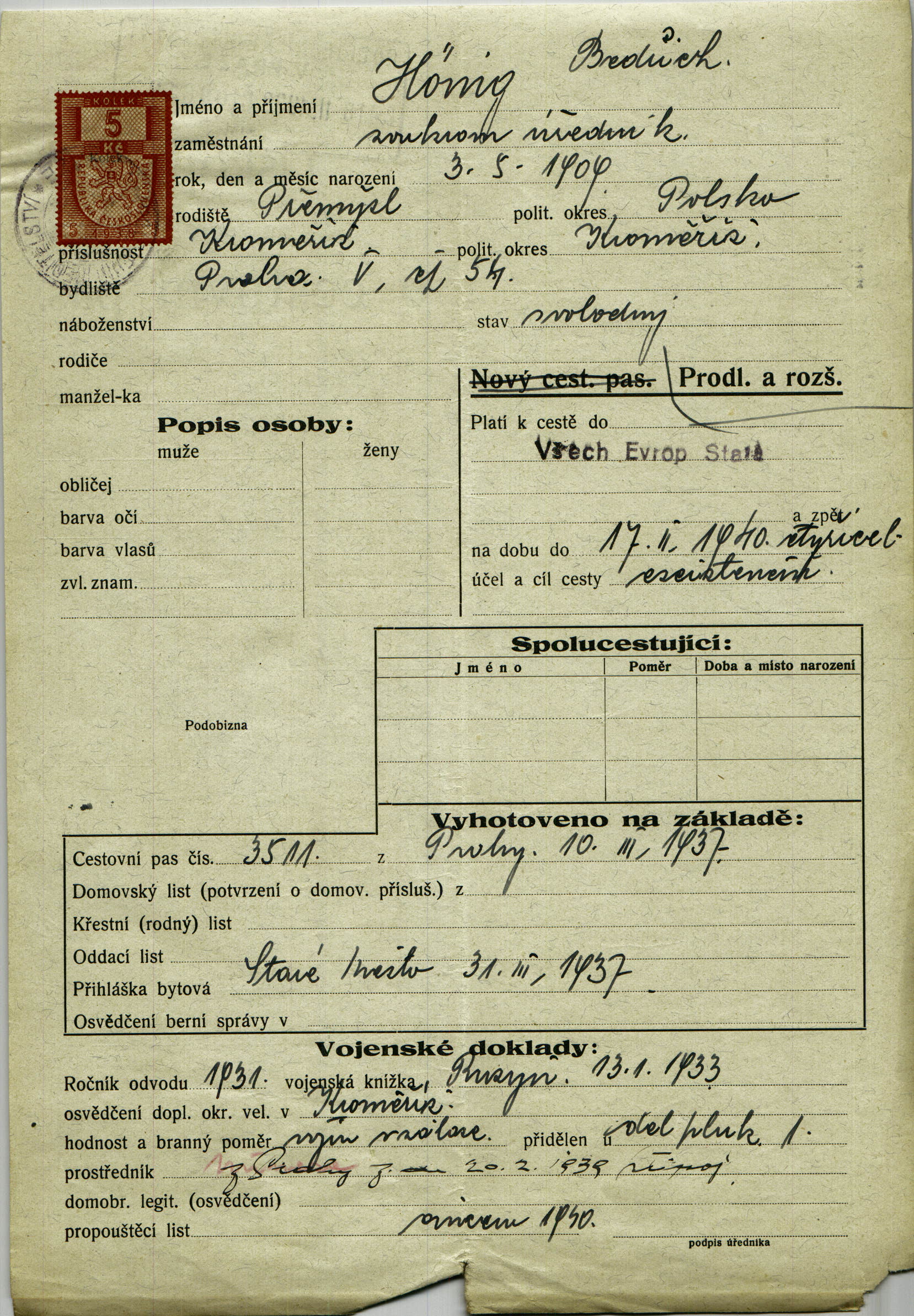 Hönig Bedřich: Žádost o prodloužení a rozšíření cestovního pasu