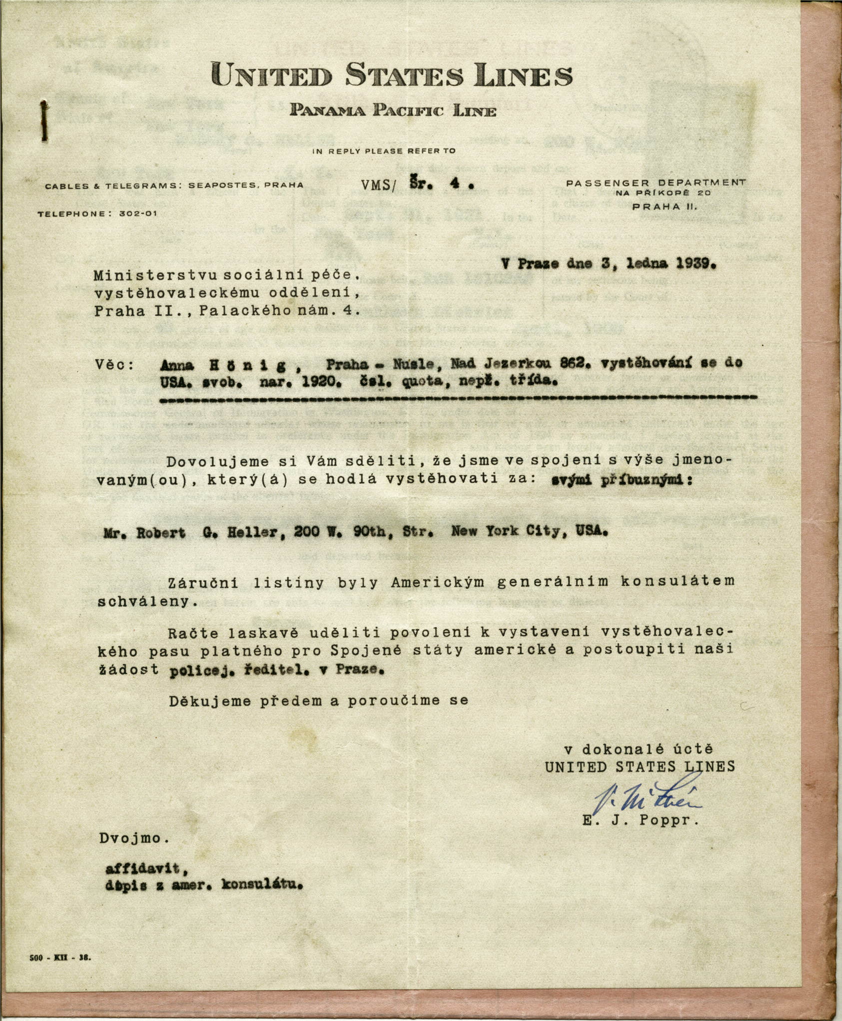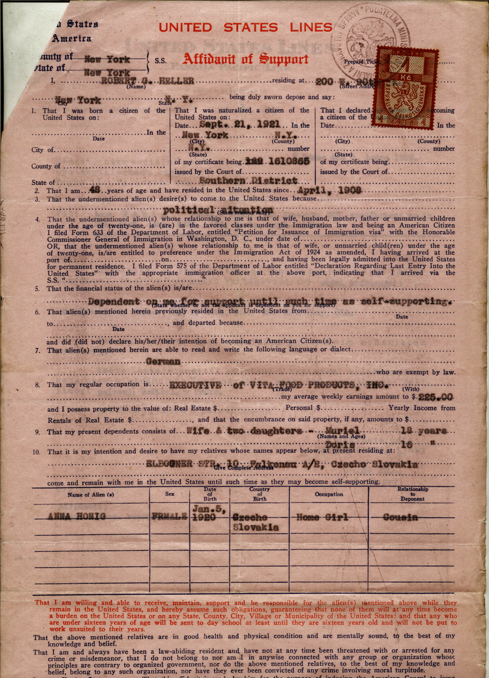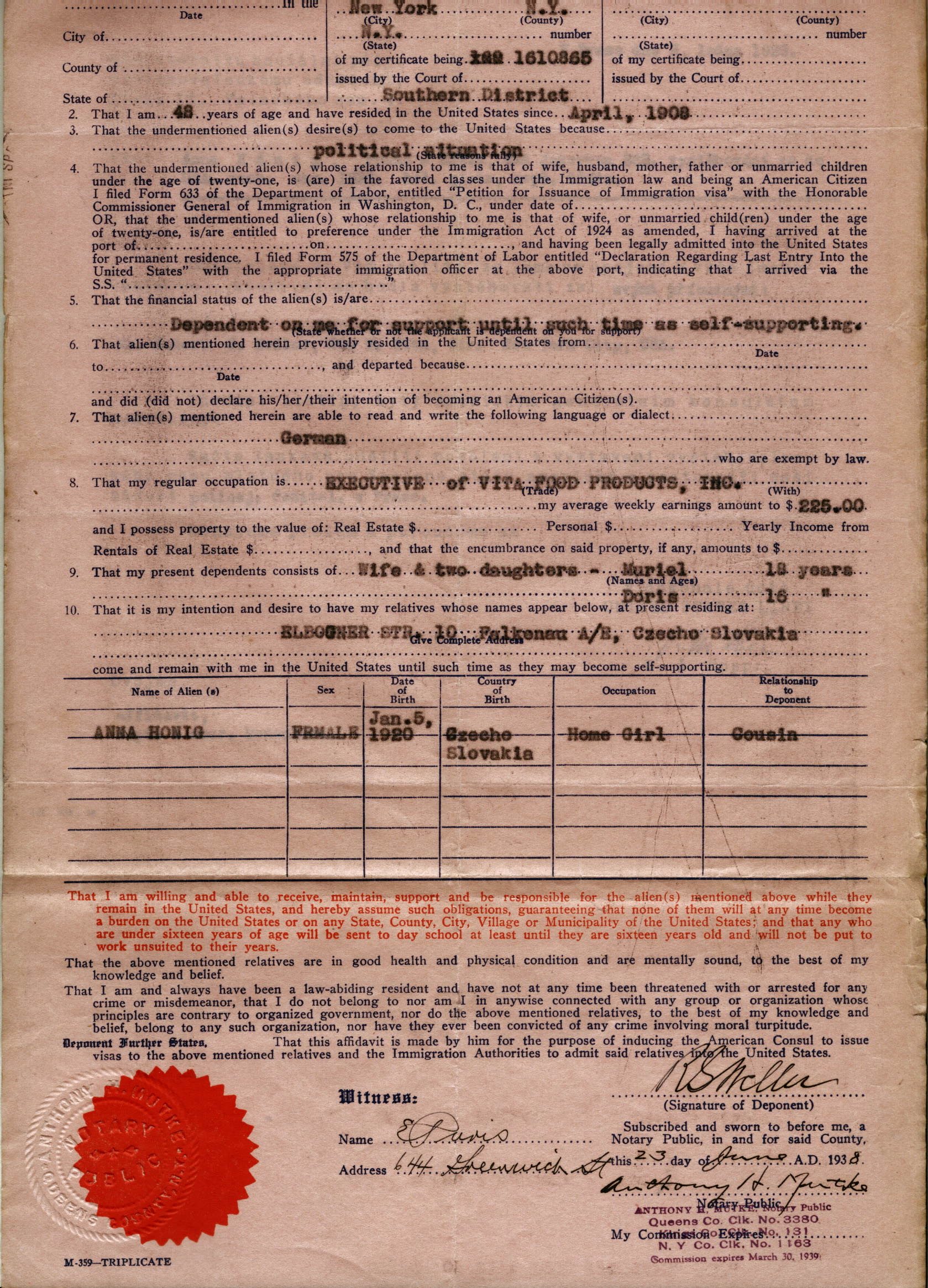 Hönigová Anna: Vystěhovalecký příslib podpory v USA (affidavit)