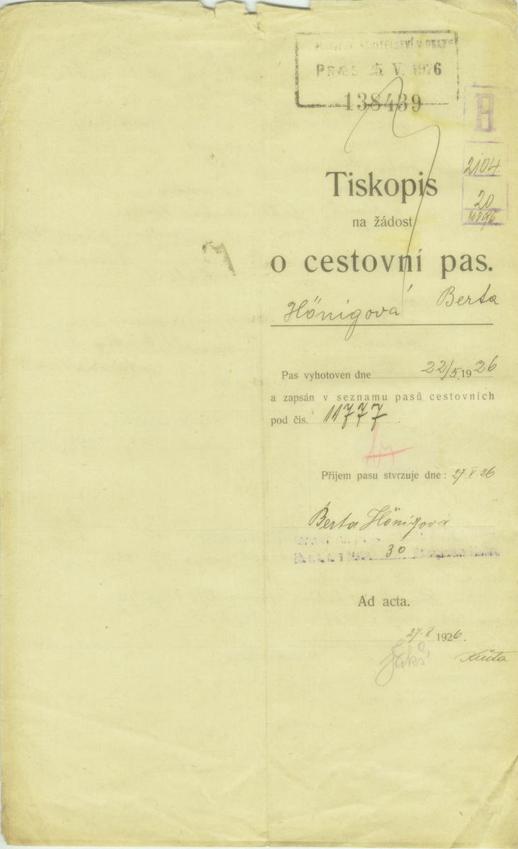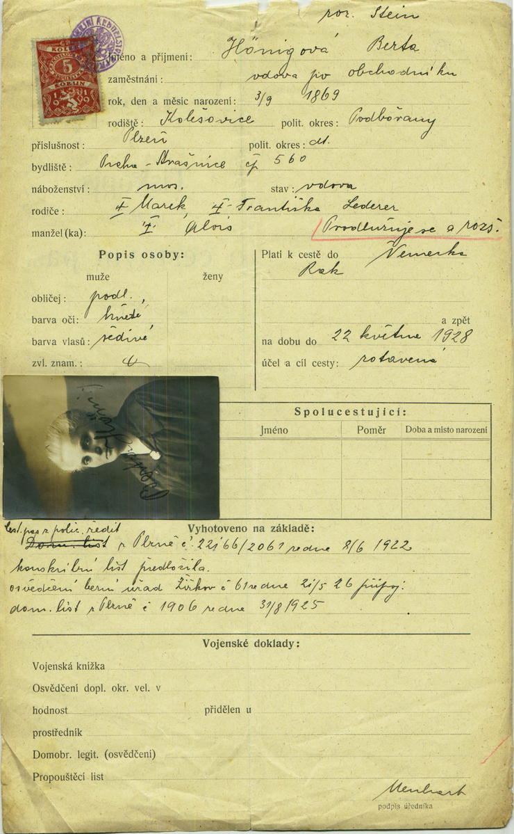 Hönigová Berta: Žádost o prodloužení a rozšíření cestovního pasu