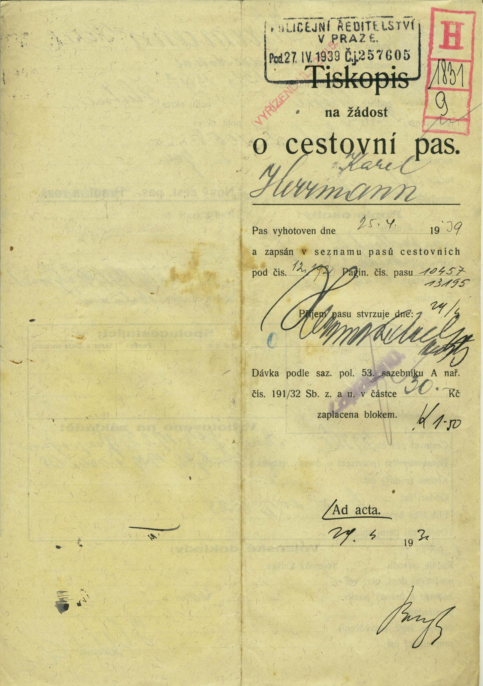 Herrmann Karel: Žádost o vydání cestovního pasu
