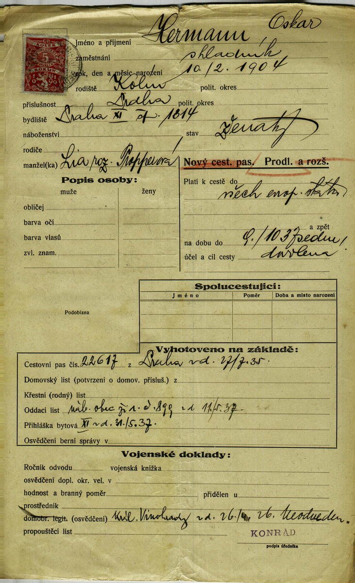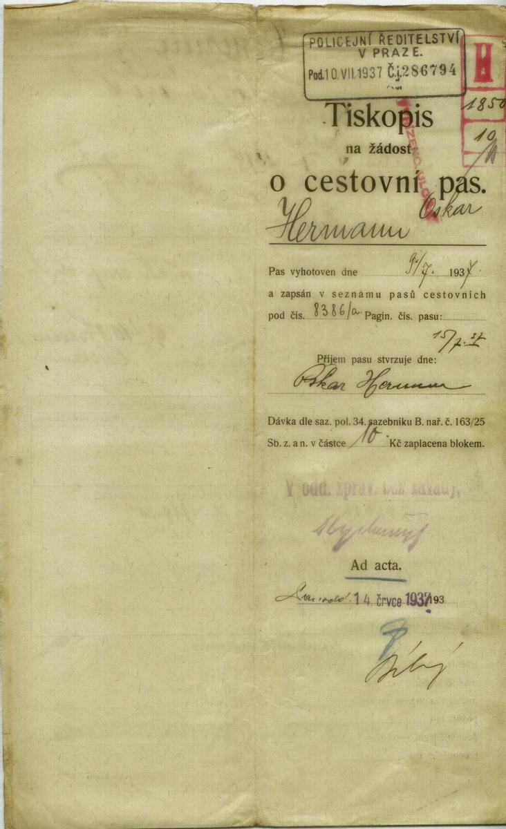 Hermann Oskar: Žádost o prodloužení a rozšíření cestovního pasu