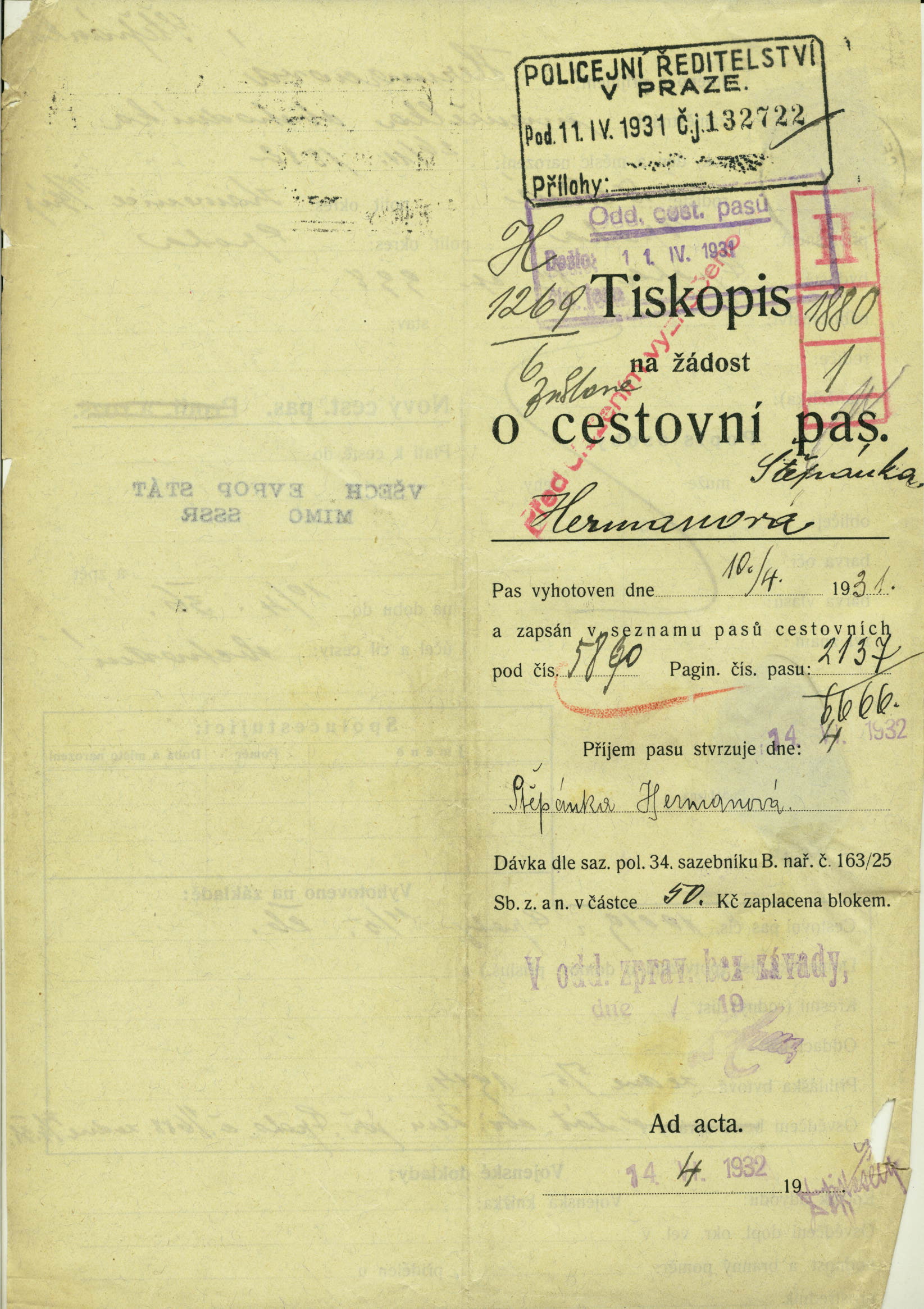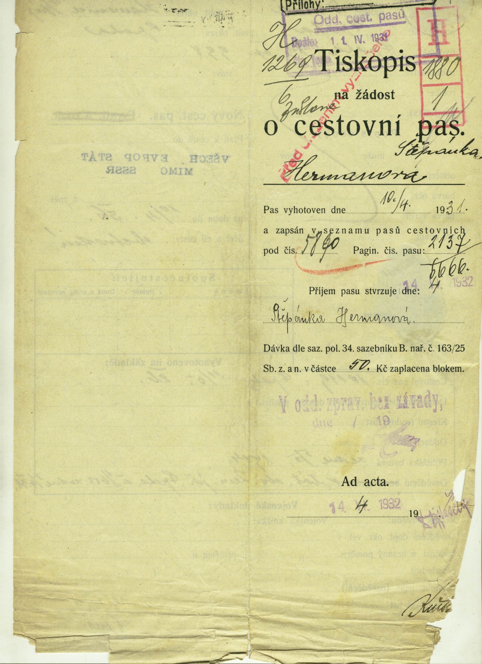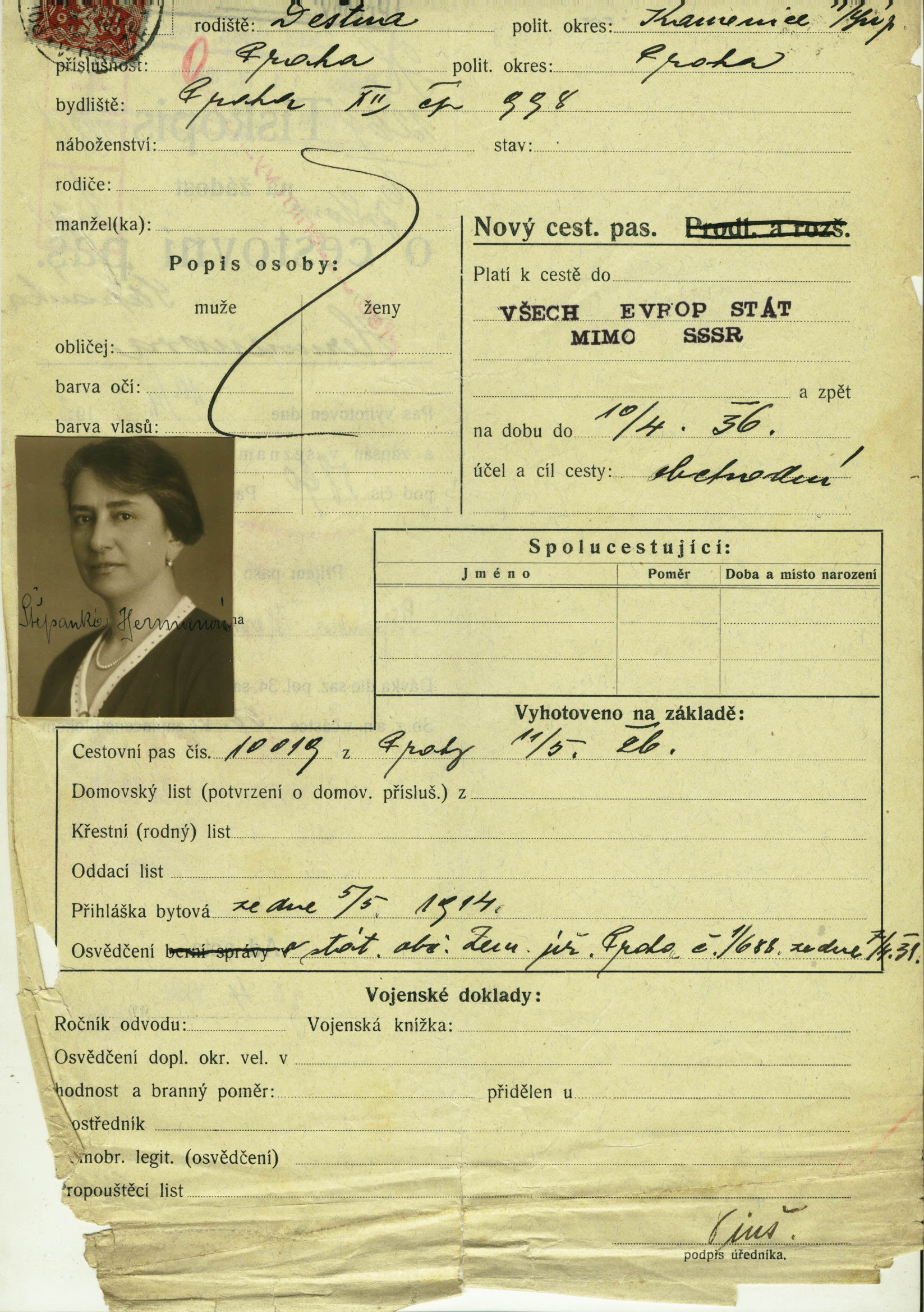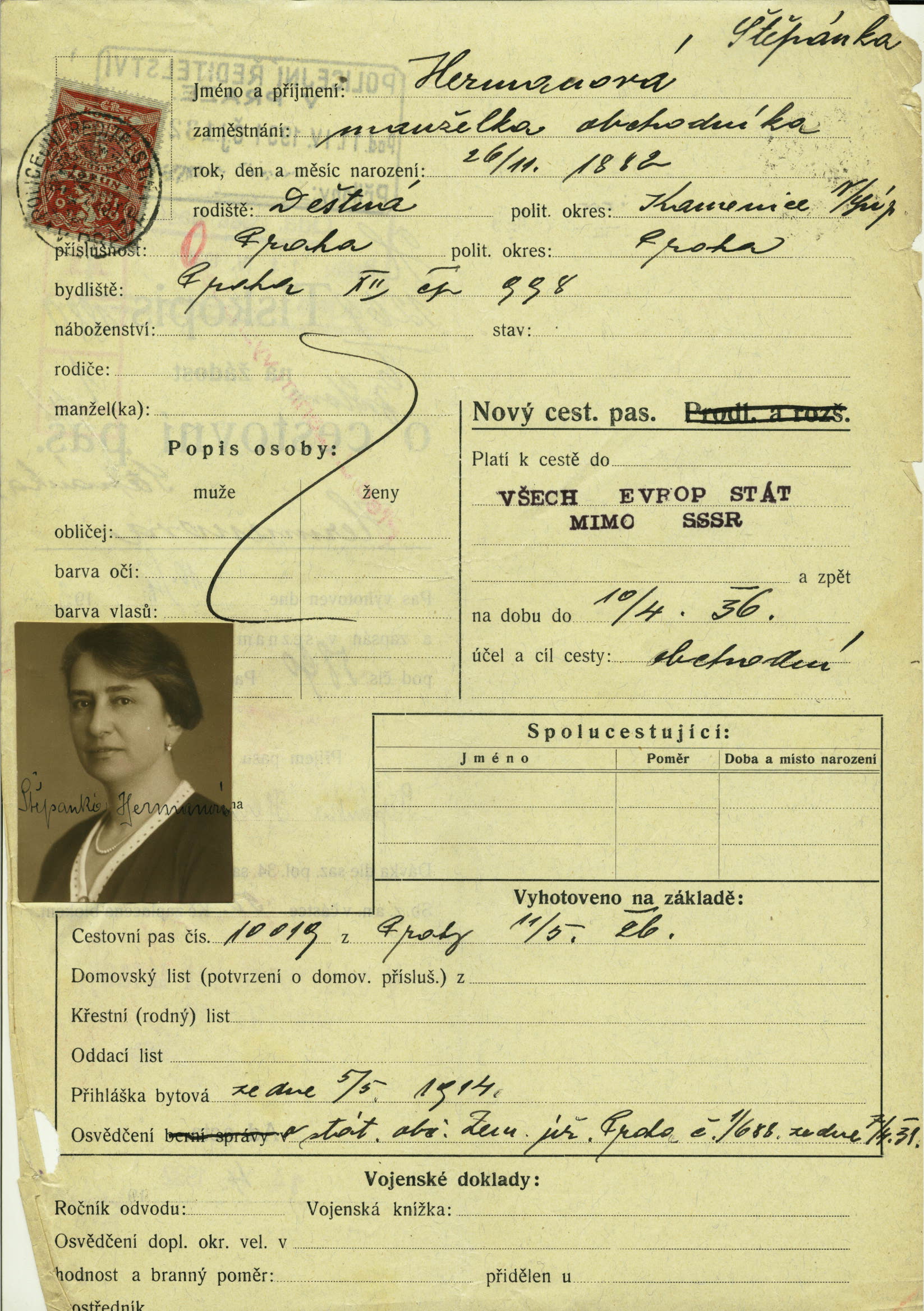 Herrmannová Štěpánka: Žádost o vydání cestovního pasu