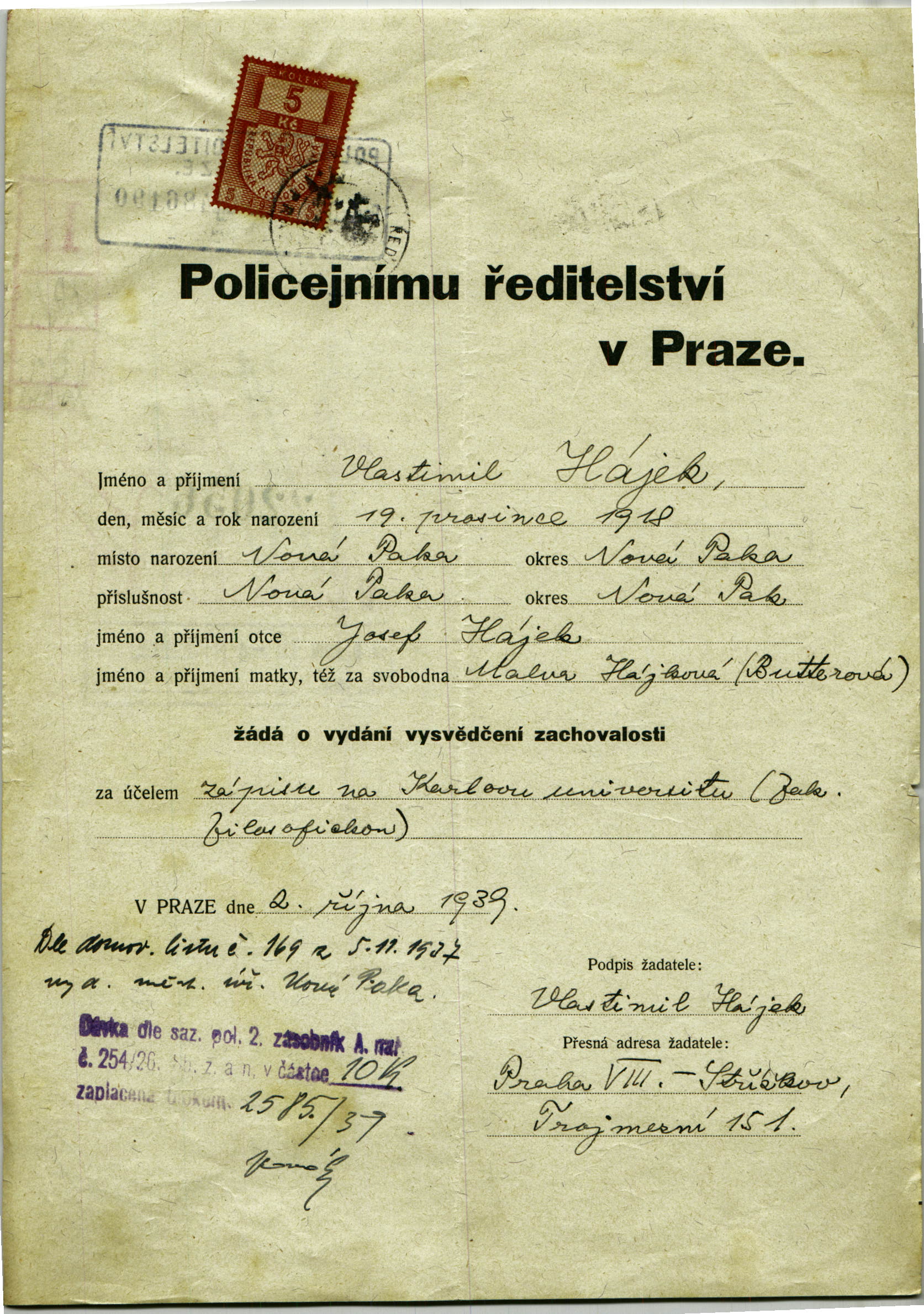 Hájek Vlastimil: Žádost o vystavení vysvědčení zachovalosti