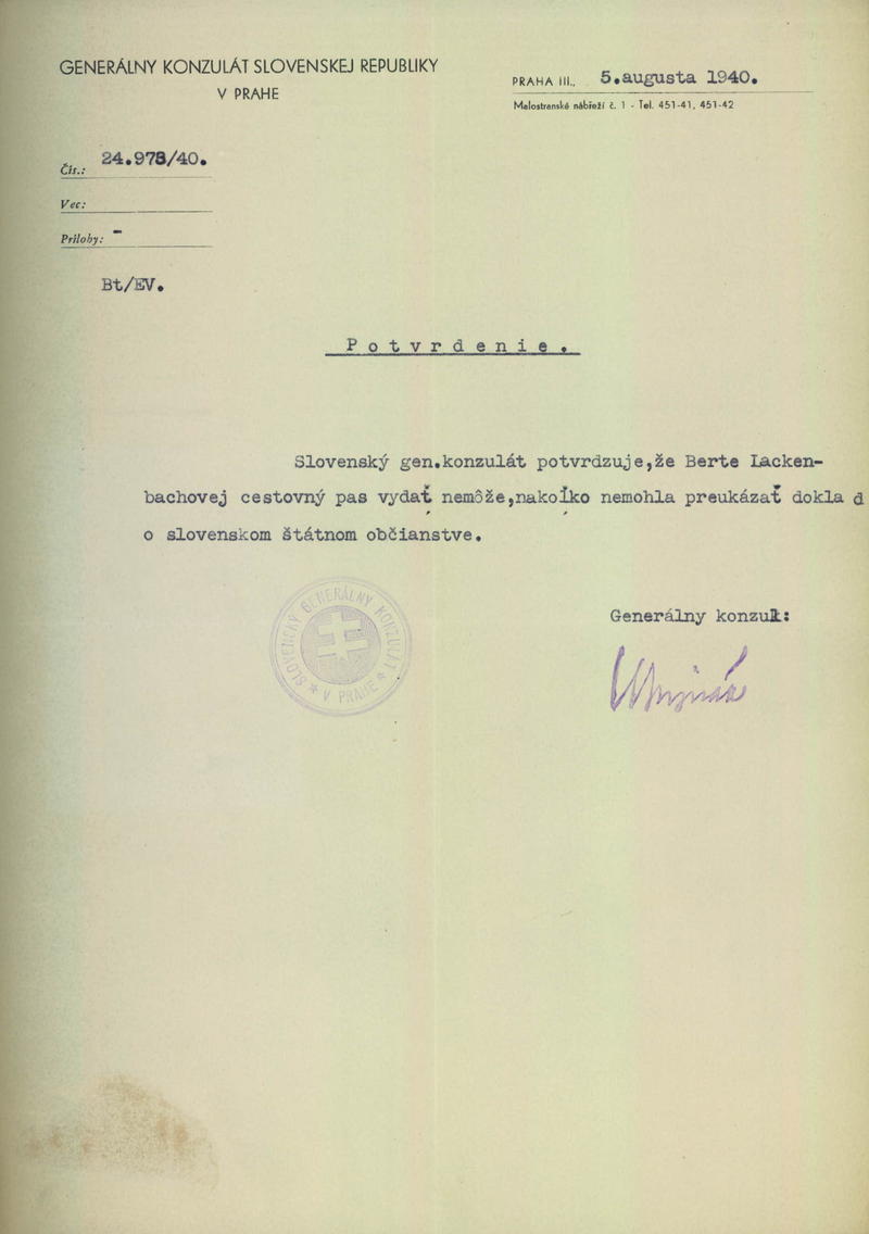 Lackenbachová Berta: Zamítnutí žádosti o vydání cestovního pasu