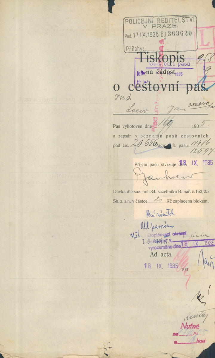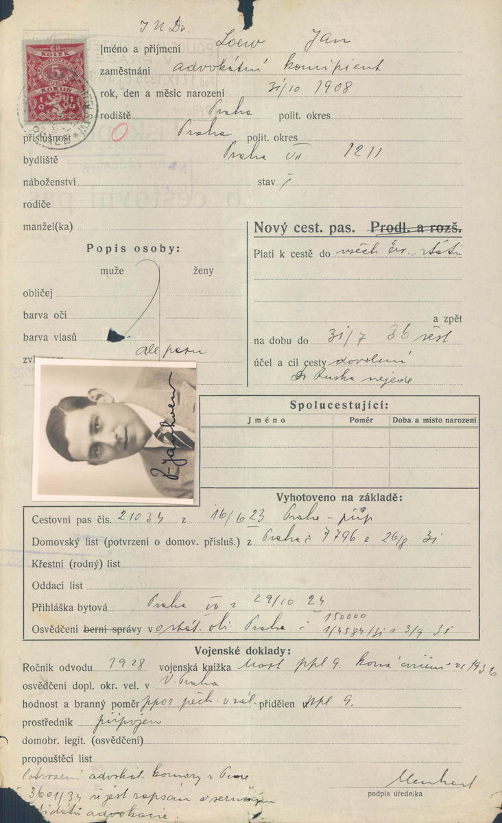 Löw Hanuš: Žádost o vydání cestovního pasu