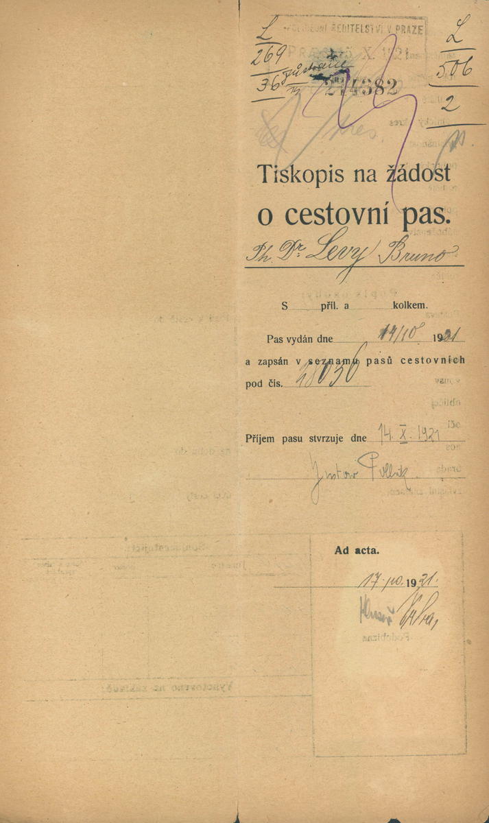 Levy Bruno J.: Žádost o vydání cestovního pasu