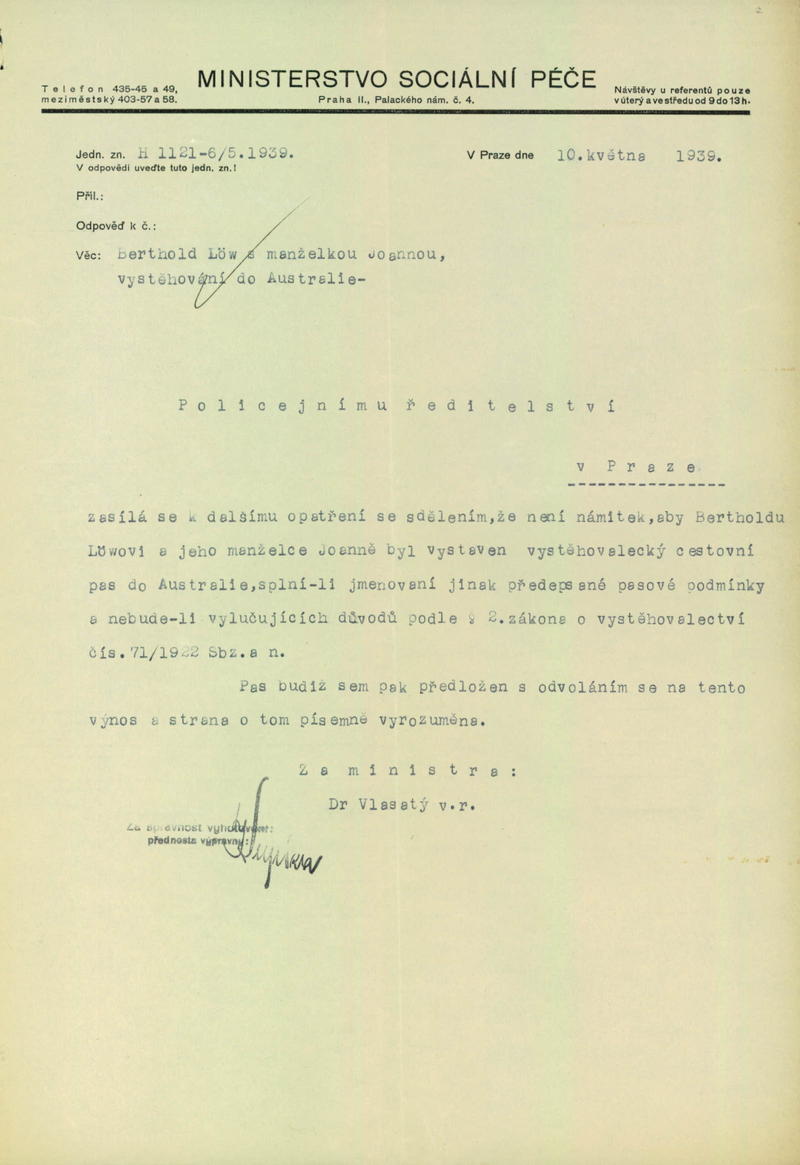 Löw Bertold: Souhlas s vydáním vystěhovaleckého cestovního pasu