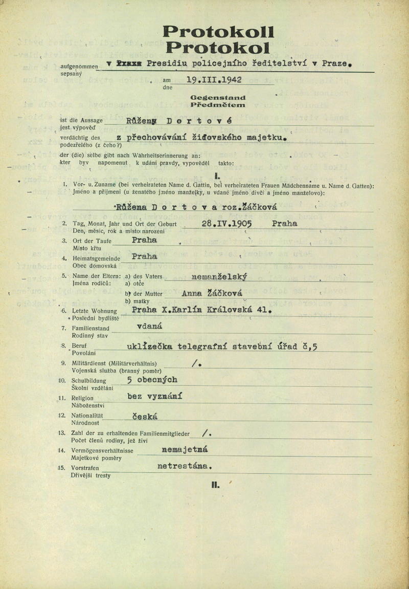 Löwenbachová Růžena: Protokol o výslechu podezřelé z přechovávání židovského majetku