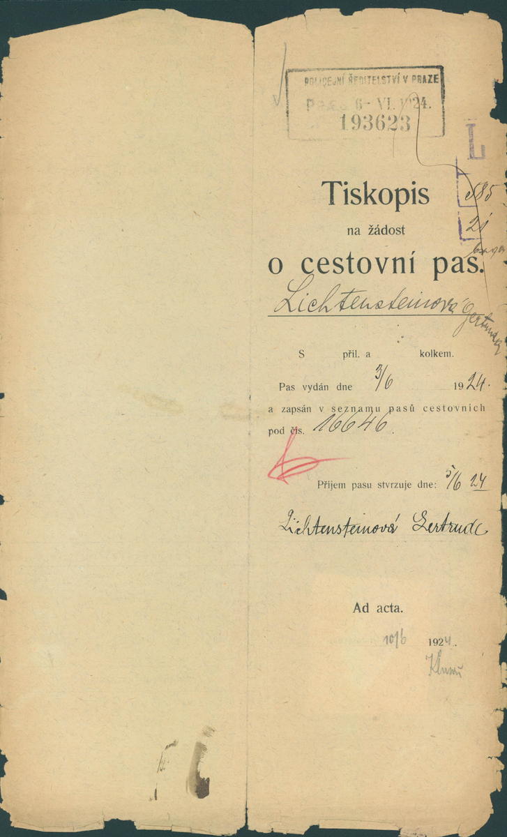 Lichtensteinová Gertruda: Žádost o vydání cestovního pasu
