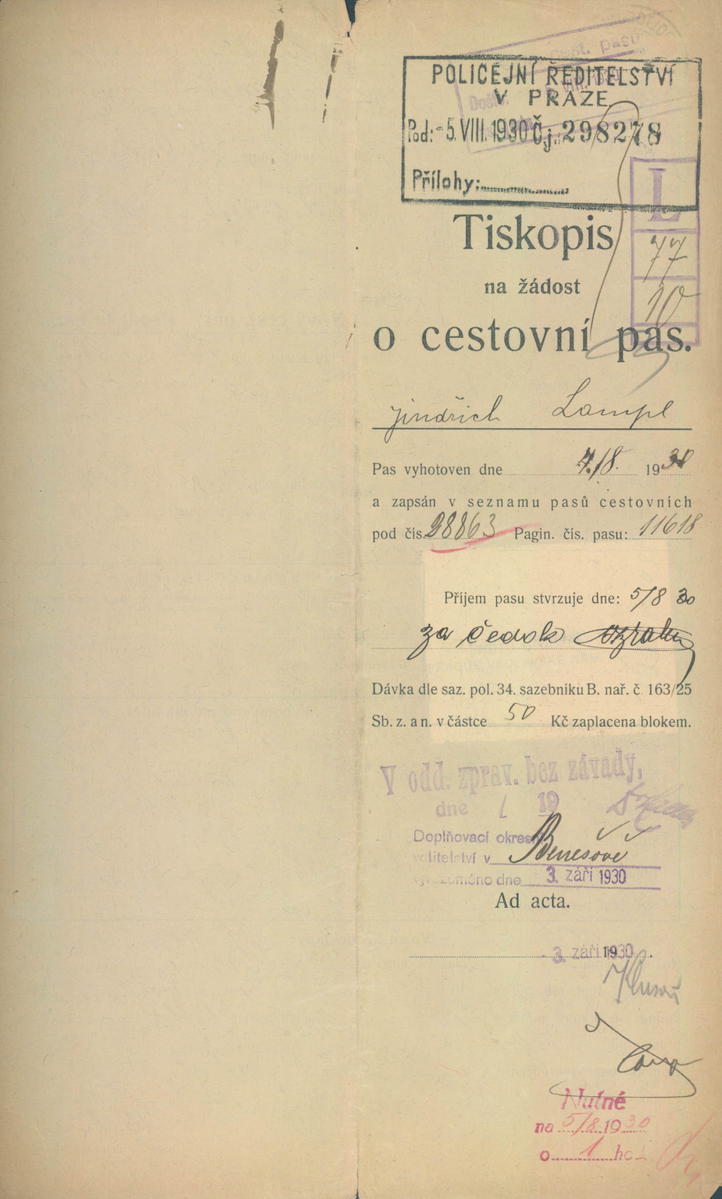 Lampl Jindřich: Žádost o vydání cestovního pasu