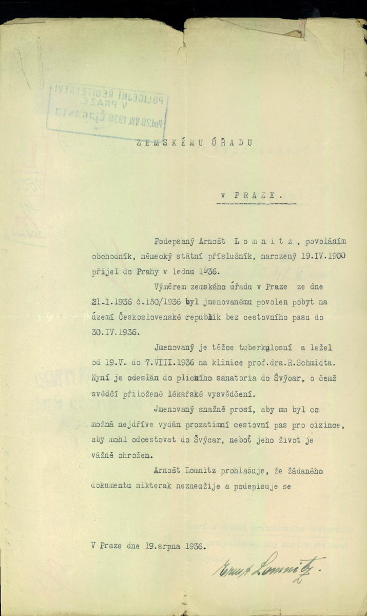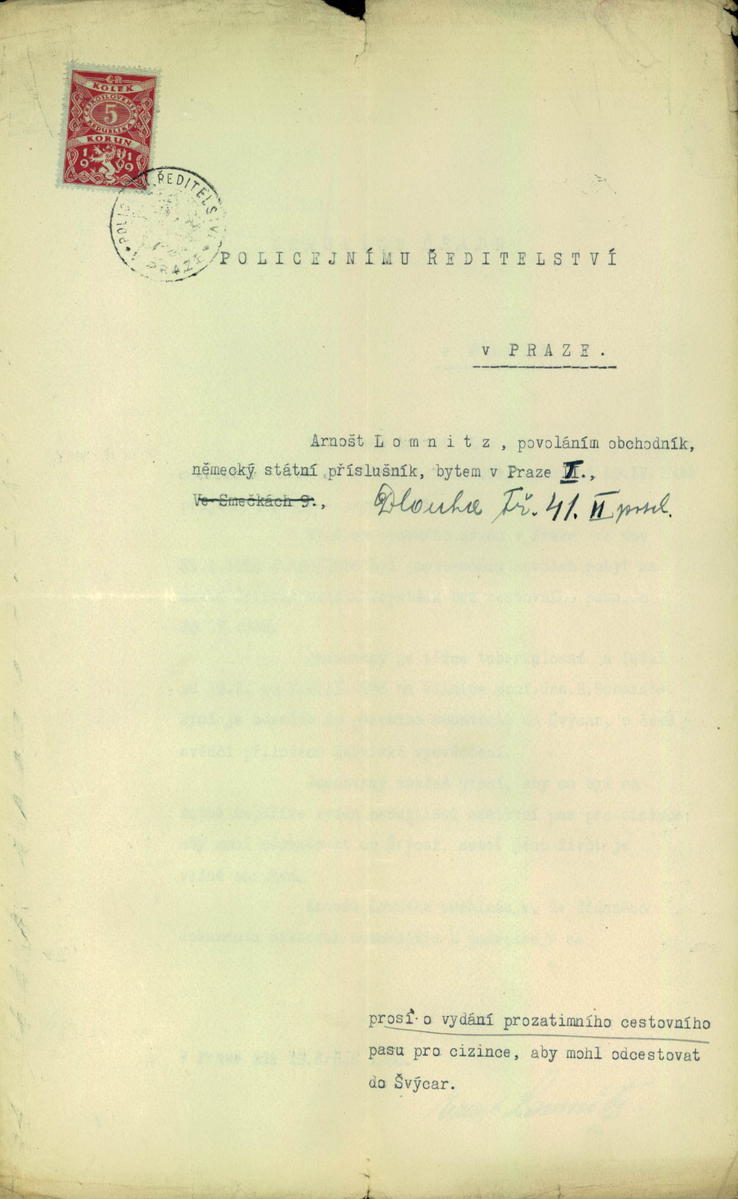 Lomnitz Arnošt: Žádost o vydání prozatímního cestovního pasu