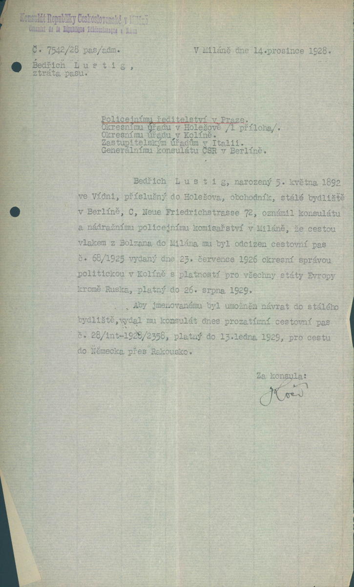 Lustig Bedřich: Řízení ve věci ztráty cestovního pasu