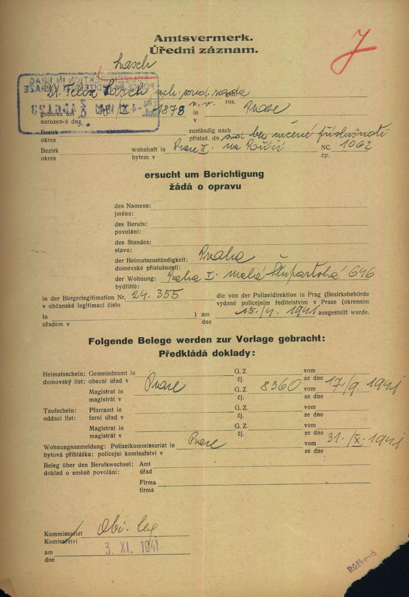 Lasch Felix Adalbert: Žádost o opravu v občanské legitimaci