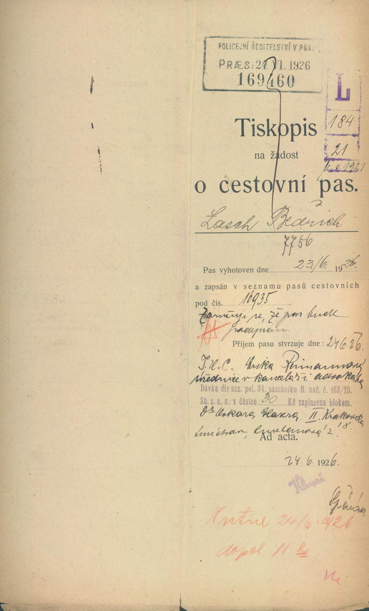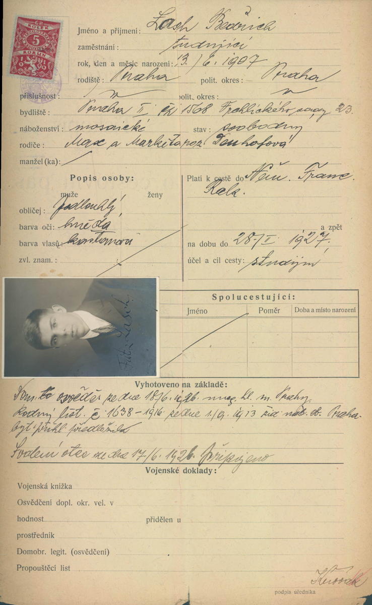 Lasch Bedřich: Žádost o vydání cestovního pasu