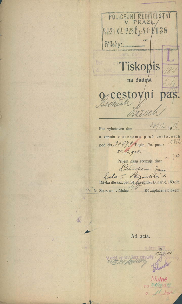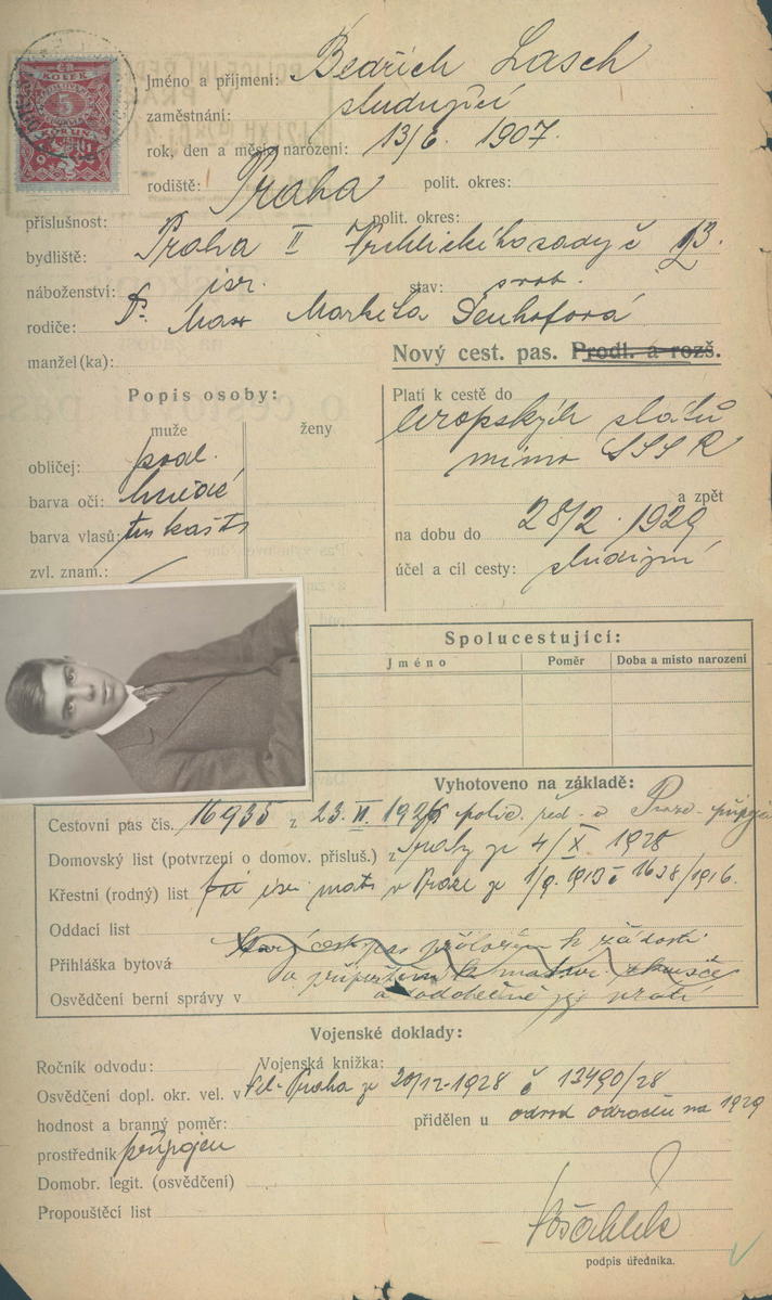 Lasch Bedřich: Žádost o vydání cestovního pasu