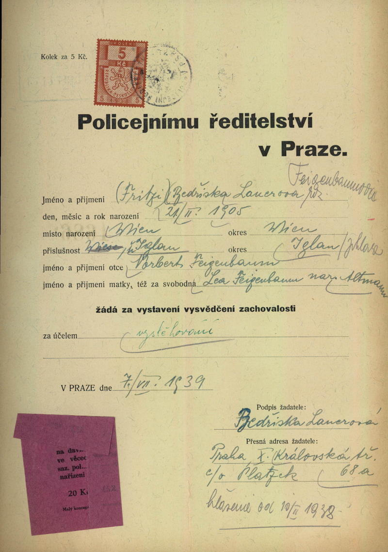 Lauerová Bedřiška: Žádost o vystavení vysvědčení zachovalosti