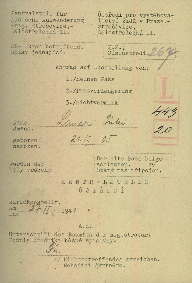 Lauerová Bedřiška: Záznam o vrácení spisu Zentralstelle