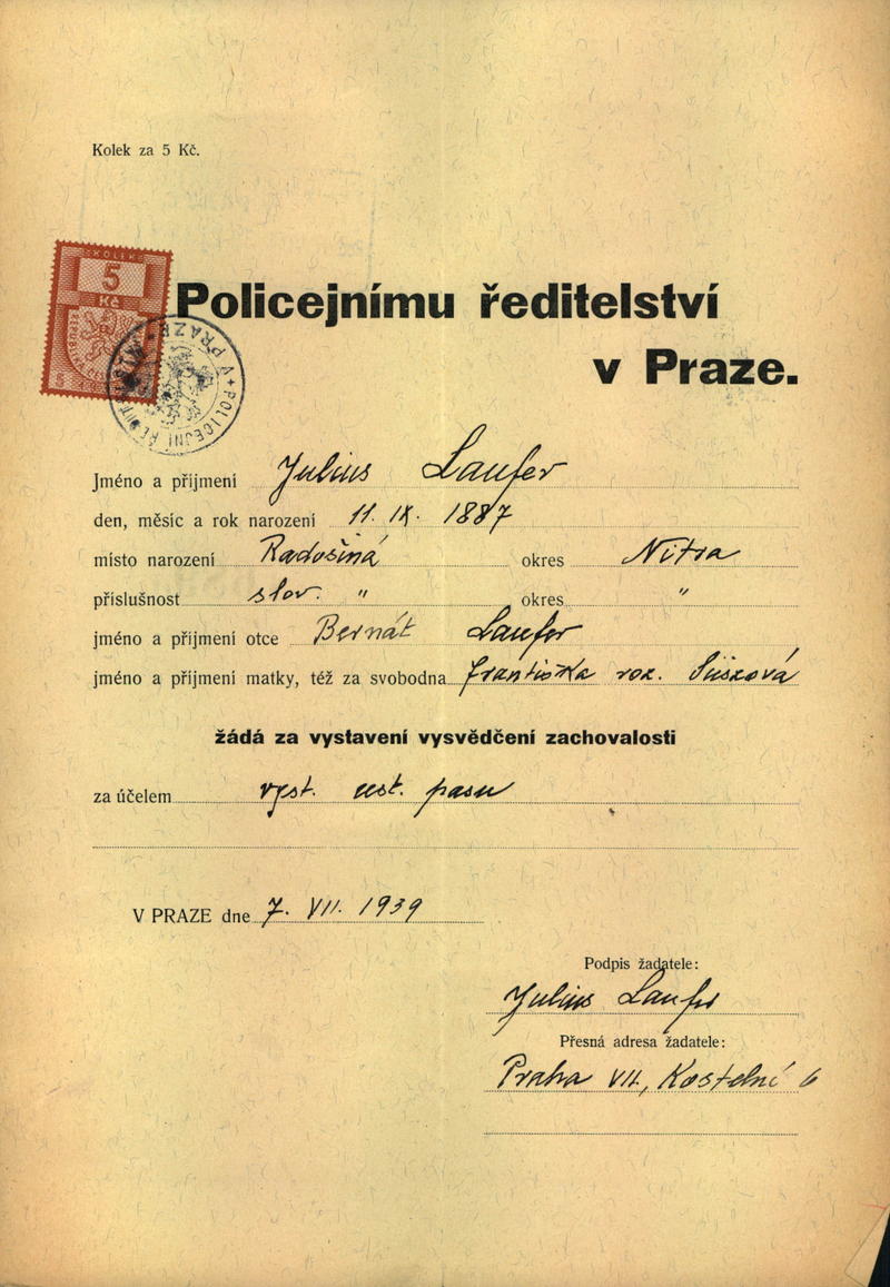 Laufer Julius: Žádost o vystavení vysvědčení zachovalosti