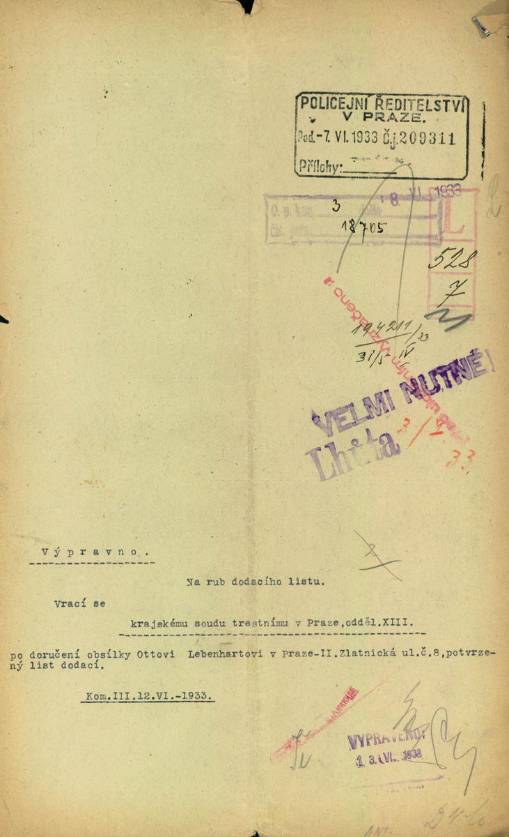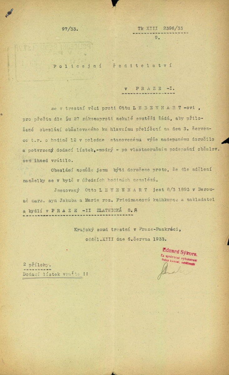 Lebenhart Otto: Řízení ve věci soudního obeslání obžalovaného