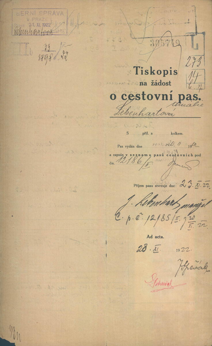 Lebenhartová Amálie: Žádost o vydání cestovního pasu
