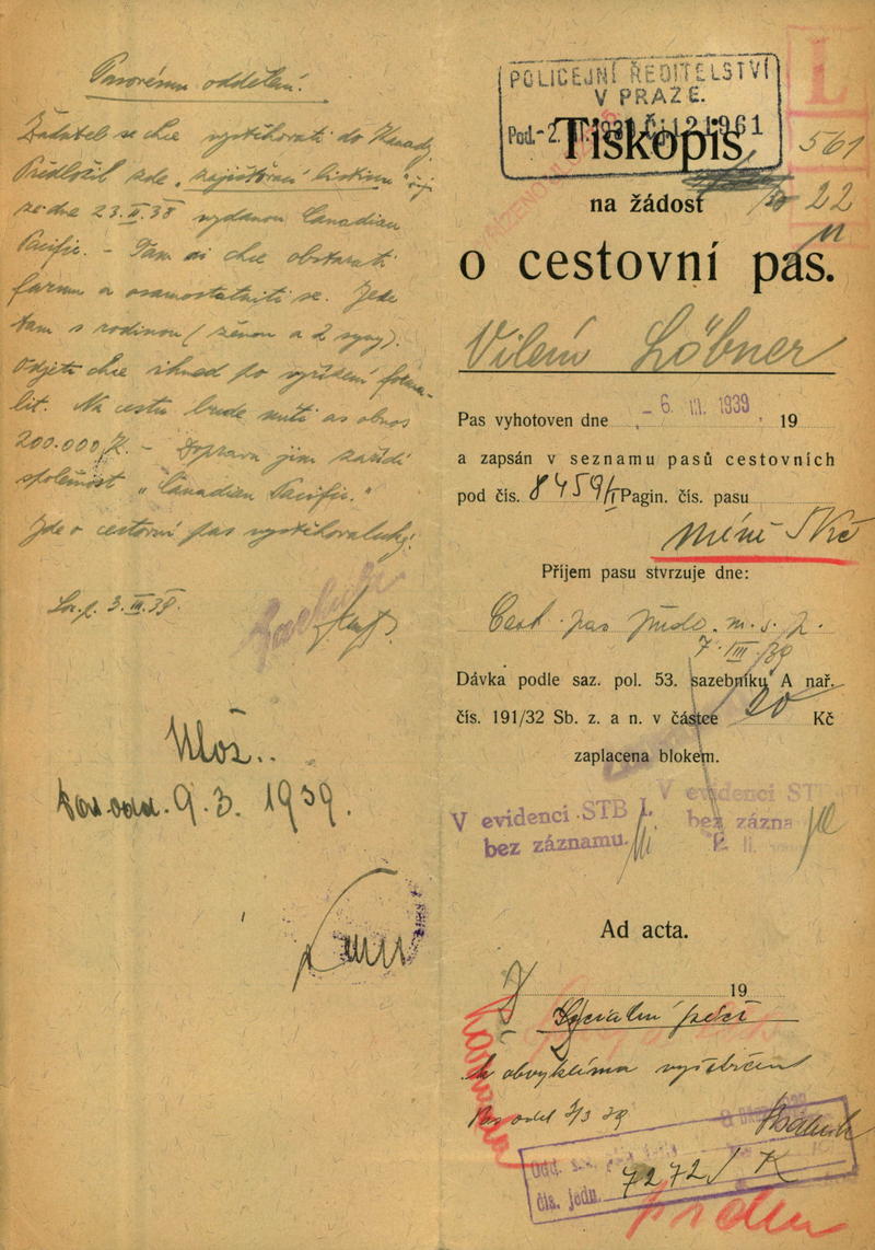 Löbner Vilém: Žádost o prodloužení a rozšíření cestovního pasu